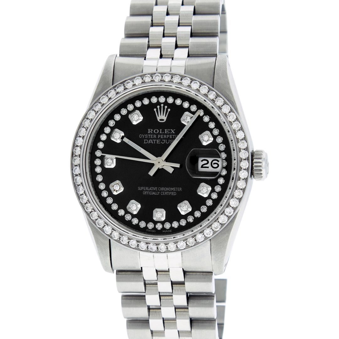 One Mens Pre Owned Rolex Stainless Steel Datejust Polished Bright with Satin Finish, Stainless Steel Case: 36mm, Stainless Steel Crown, Custom Bezel: New Stainless Steel Beadset Diamond Bezel, Diamond Count: 54 Diamonds. Custom Crystal: New Sapphire With Date Window. Custom Hands: New Luminescent Hands. Rolex Movement: Automatic Winding Movement 3035. Custom Dial: Custom Black Dial With Custom Added Diamonds, Diamond Count: 58 Diamonds In Dial. Date Window: 3 O'Clock Position Date Display, Quickset, Model: Quickset Datejust. Condition: G-6 Extra Fine. Rolex Bracelet: Stainless Steel Jubilee Band. Bright Polish And Satin Finish. 7.0 Inch Length, Adjustable. Standard Clasp, With Rolex Logo. This Watch Has Been Serviced Time Tested And Is In Excellent Condition It Is Free Of All Scratches And Dents.