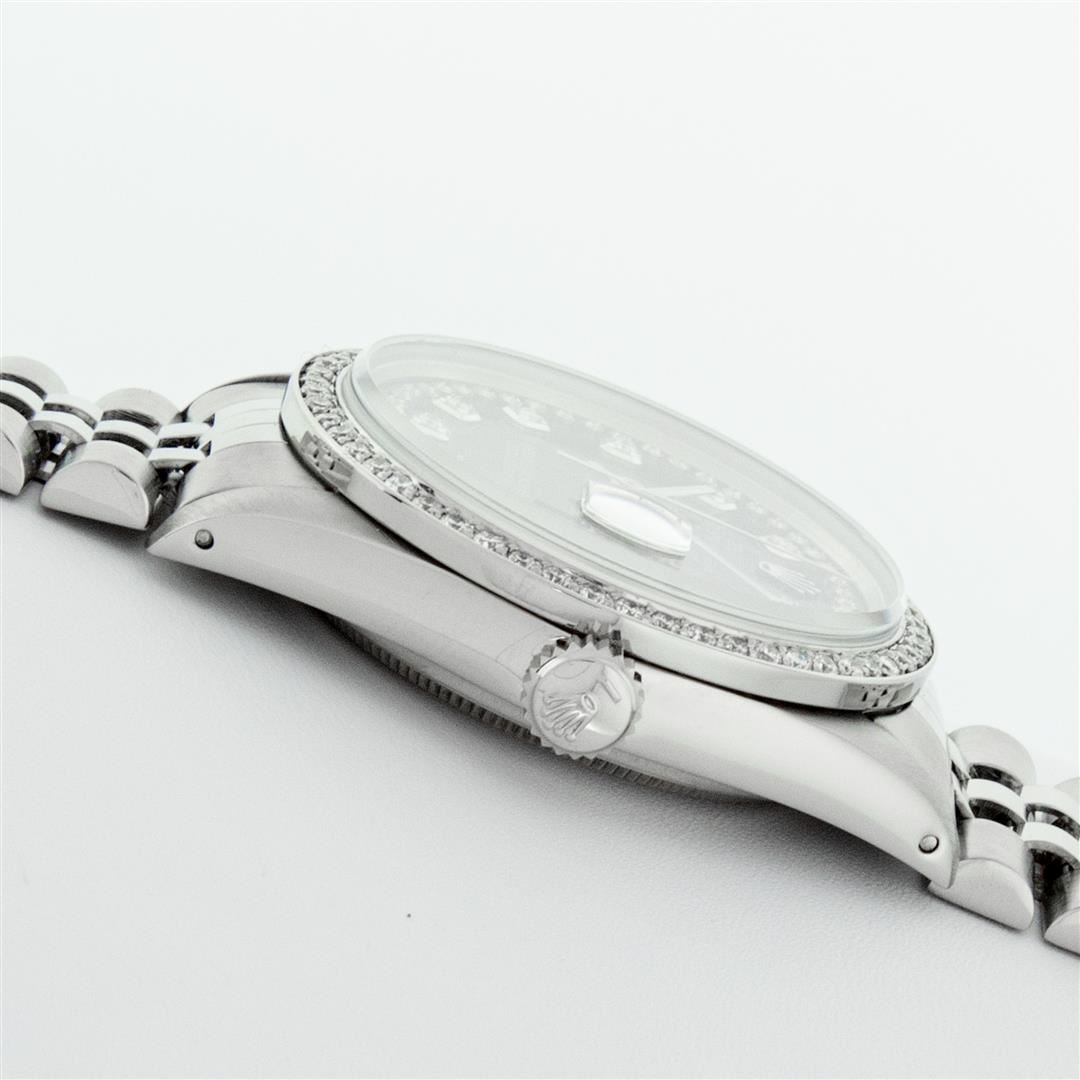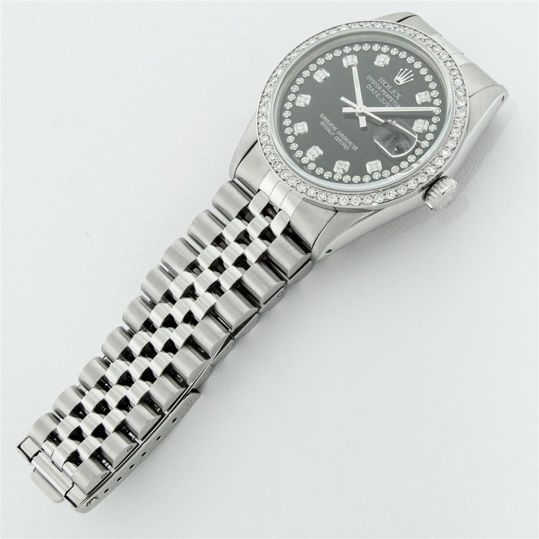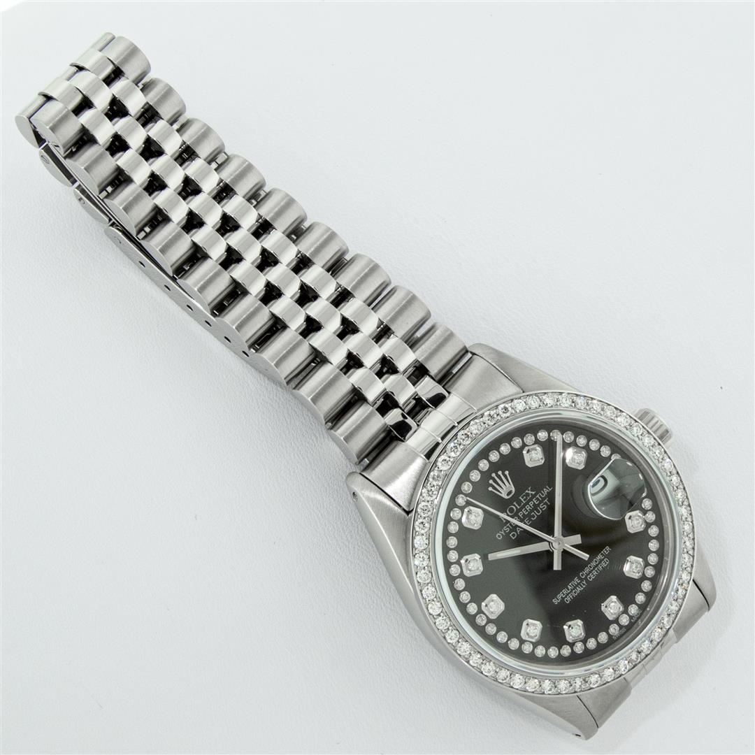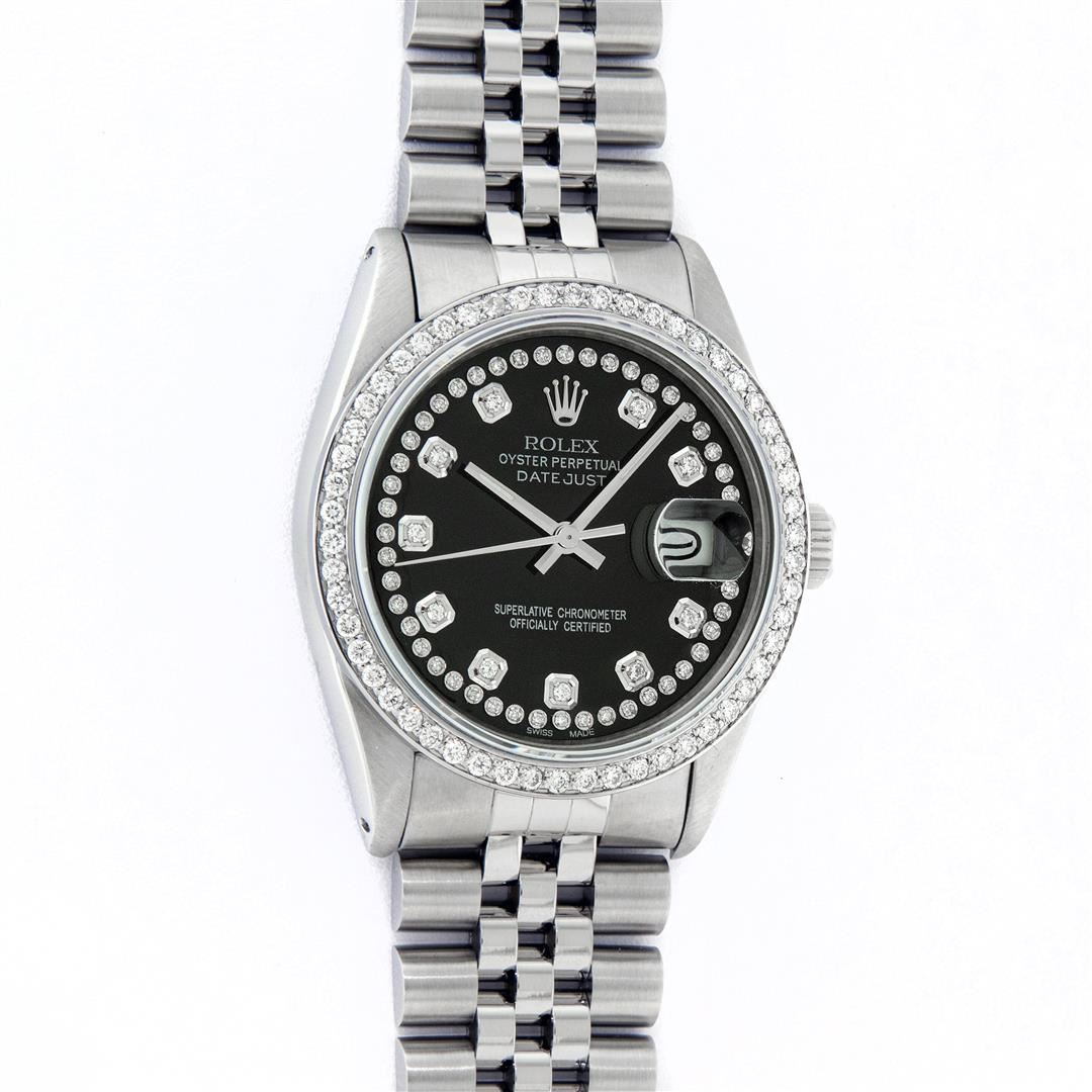 One Mens Rolex Stainless Steel Datejust Polished Bright with Satin Finish, This Watch Has Been Serviced & Electronically Tested, Stainless Steel Case: 36mm, Stainless Steel Crown, Custom Bezel: New Stainless Steel Beadset Diamond Bezel, Diamond Count: 54 Diamonds, Total Weight 1.00 Carat, Clarity: SI-VS, Color: G to H. Custom Crystal: New Synthetic Sapphire Cyclops Lens. Custom Hands: New Luminescent Hands. Movement: Automatic Winding Movement. Custom Dial: Black String Diamond Dial, Diamond Count: 58 Diamonds In Dial, Color: G to H, Clarity: VS2-SI1. Date Window: 3 O'Clock Position Date Display, Quickset, Model: Datejust. Condition: G-6 Extra Fine. Bracelet: Stainless Steel Jubilee Band. Bright Polish & Satin Finish. 7.0 Inch Length, Adjustable. Standard Clasp, With Rolex Logo. This Watch Has Been Serviced Time Tested And Is In Excellent Condition It Is Free Of All Scratches And Dents.