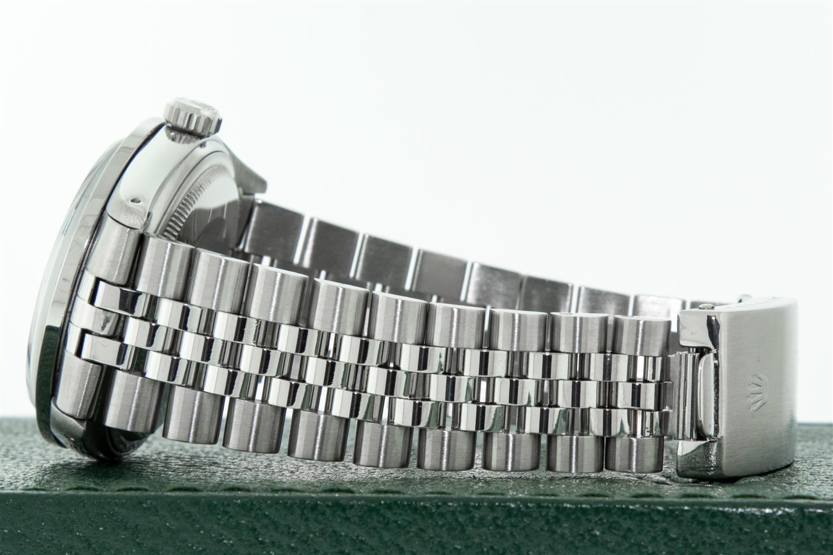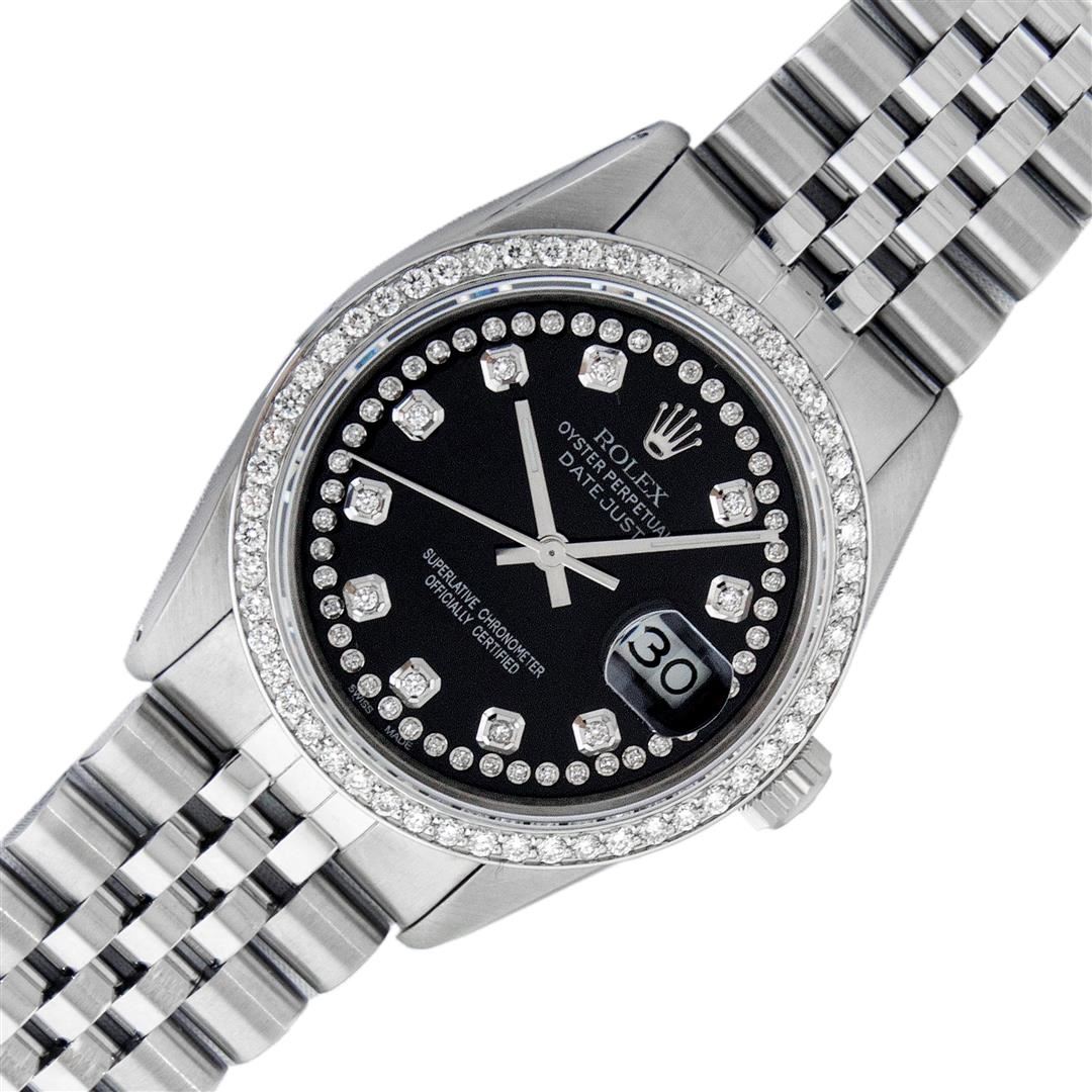 One Mens Rolex Stainless Steel Datejust Polished Bright with Satin Finish, This Watch Has Been Serviced & Electronically Tested, Stainless Steel Case: 36mm, Stainless Steel Crown, Custom Bezel: New Stainless Steel Beadset Diamond Bezel, Diamond Count: 54 Diamonds, Total Weight 1.00 Carat, Clarity: SI-VS, Color: G to H. Custom Crystal: New Synthetic Sapphire Cyclops Lens. Custom Hands: New Luminescent Hands. Movement: Automatic Winding Movement. Custom Dial: Black String Diamond Dial, Diamond Count: 58 Diamonds In Dial, Color: G to H, Clarity: VS2-SI1. Date Window: 3 O'Clock Position Date Display, Quickset, Model: Datejust. Condition: G-6 Extra Fine. Bracelet: Stainless Steel Jubilee Band. Bright Polish & Satin Finish. 7.0 Inch Length, Adjustable. Standard Clasp, With Rolex Logo. This Watch Has Been Serviced Time Tested And Is In Excellent Condition It Is Free Of All Scratches And Dents.