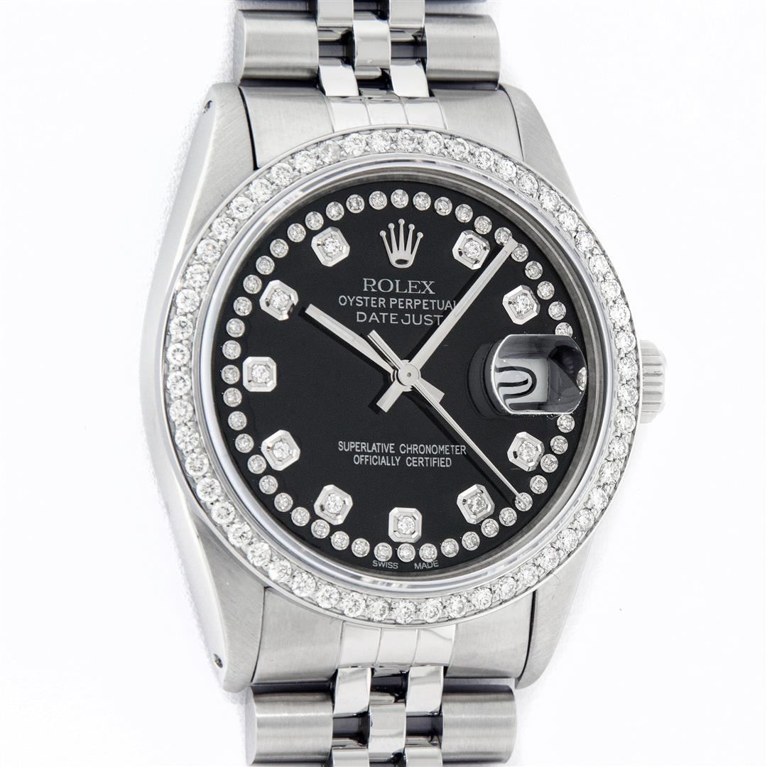 One Mens Rolex Stainless Steel Datejust Polished Bright with Satin Finish, This Watch Has Been Serviced & Electronically Tested, Stainless Steel Case: 36mm, Stainless Steel Crown, Custom Bezel: New Stainless Steel Beadset Diamond Bezel, Diamond Count: 54 Diamonds, Total Weight 1.00 Carat, Clarity: SI-VS, Color: G to H. Custom Crystal: New Synthetic Sapphire Cyclops Lens. Custom Hands: New Luminescent Hands. Movement: Automatic Winding Movement. Custom Dial: Black String Diamond Dial, Diamond Count: 58 Diamonds In Dial, Color: G to H, Clarity: VS2-SI1. Date Window: 3 O'Clock Position Date Display, Quickset, Model: Datejust. Condition: G-6 Extra Fine. Bracelet: Stainless Steel Jubilee Band. Bright Polish & Satin Finish. 7.0 Inch Length, Adjustable. Standard Clasp, With Rolex Logo. This Watch Has Been Serviced Time Tested And Is In Excellent Condition It Is Free Of All Scratches And Dents.