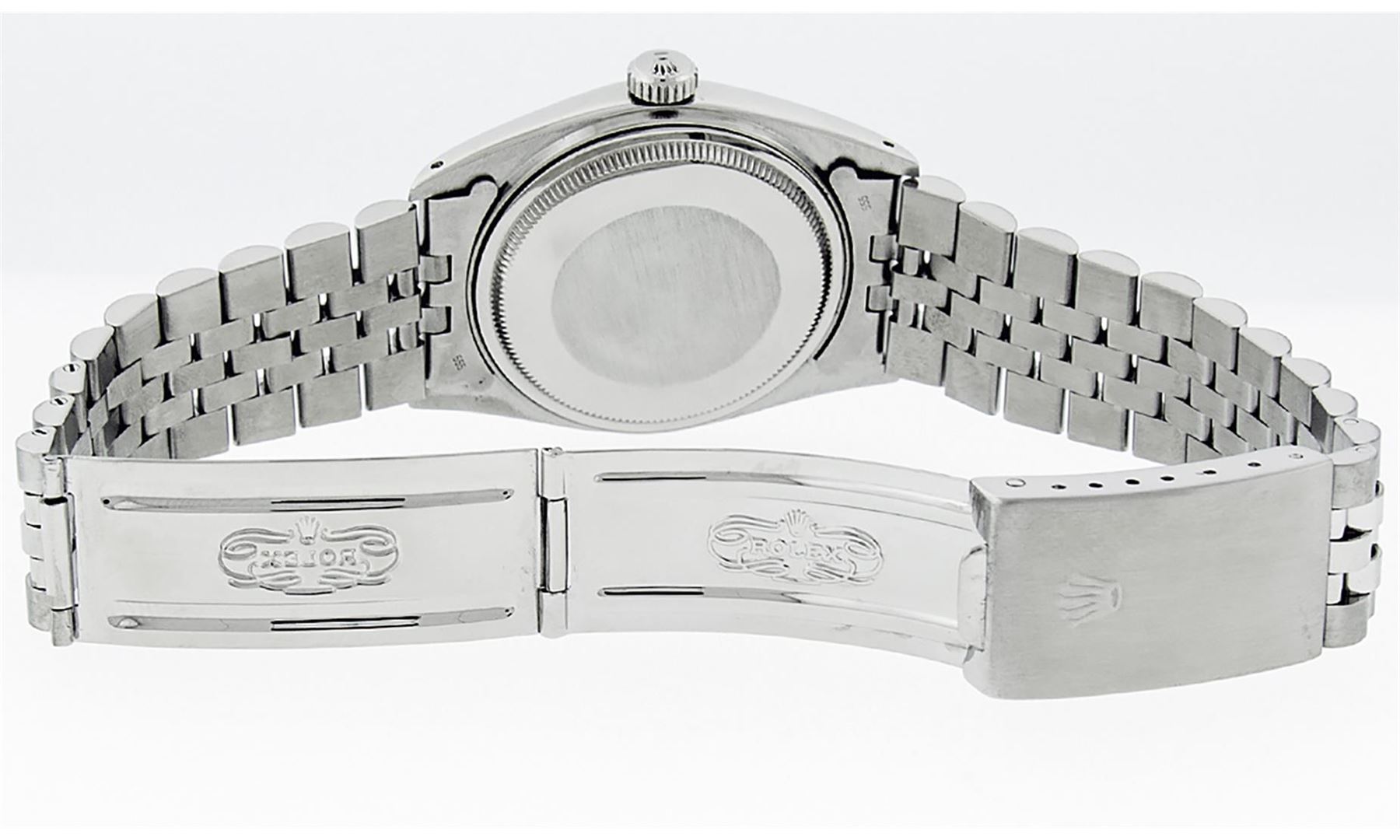 One Mens Pre Owned Rolex Datejust Polished Bright with Satin Finish, Serviced & Electronically Tested, Rolex Stainless Steel Case: 36mm, Rolex Stainless Steel Crown, Rolex Bezel: 14K White Gold Fluted Bezel. Custom Crystal: New Acrylic Cyclops Lens. Custom Hands: New Hands. Rolex Movement: Automatic Winding Movement. Custom Dial: Refinished Silver With Added Diamonds, Diamond Count: 10 Diamonds in Dial, G To H In Color, Si-VS Clarity. Date Window: 3 O'Clock Position Date Display, Quickset, Model: Datejust, Condition: G-6 Extra Fine. Rolex Bracelet: Stainless Steel Jubilee Band. Bright Polish & Satin Finish. 7.0 Inch Length, Adjustable. Standard Clasp, With Rolex Logo. Watch Has Been Serviced And Polished It Is Free Of All Scratches And Dents.