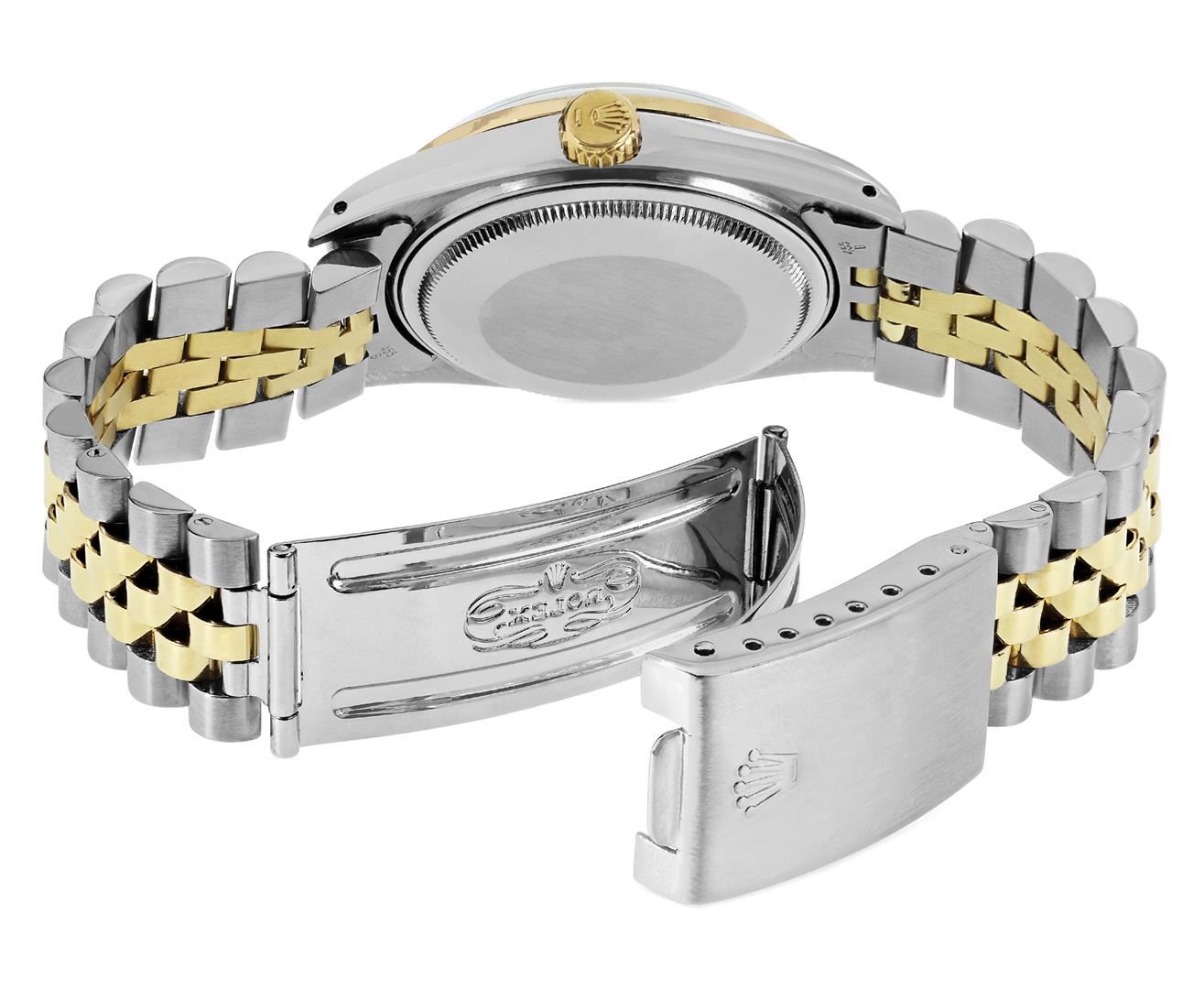One Mens Pre Owned Yellow Gold And Steel Two Tone Rolex Datejust Polished, Serviced & Electronically Tested, Rolex Yellow Gold & Stainless Steel Case: 36mm, Rolex Yellow Gold Crown, Custom Bezel: New 18K Yellow Gold Beadset Diamond Bezel, Diamond Count: 44 Diamonds, Clarity: SI-VS, Color: G to H. Custom Crystal: New Sapphire With Magnified Date Window. Custom Hands: New Luminecent Hands. Rolex Movement: Automatic Winding Movement 3035. Rolex Dial: Champagne Dial With Index Hour Markers and Dash Track With Lumi Dots. Date Window: 3 O'Clock Position Date Display, Quickset, Model: Quickset Datejust. Condition: G-6 Extra Fine. Rolex Bracelet: Two Tone Yellow Gold & Stainless Steel Jubilee Band. Bright Polish. 7.0 Inch Length, Adjustable. Fold Clasp, With Rolex Logo. This Watch Has Been Serviced Time Tested And Is In Excellent Condition It Is Free Of All Scratches And Dents. This Watch Comes With A Rolex Box.