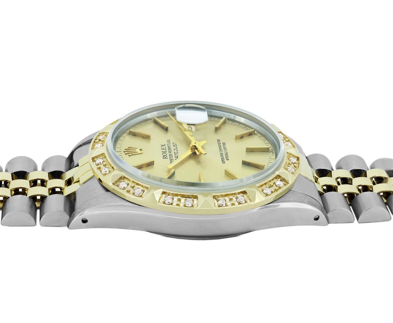 One Mens Pre Owned Yellow Gold And Steel Two Tone Rolex Datejust Polished, Serviced & Electronically Tested, Rolex Yellow Gold & Stainless Steel Case: 36mm, Rolex Yellow Gold Crown, Custom Bezel: New 18K Yellow Gold Pyramid Diamond Bezel, Diamond Count: 2