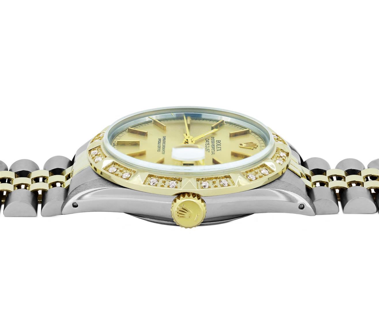 One Mens Pre Owned Yellow Gold And Steel Two Tone Rolex Datejust Polished, Serviced & Electronically Tested, Rolex Yellow Gold & Stainless Steel Case: 36mm, Rolex Yellow Gold Crown, Custom Bezel: New 18K Yellow Gold Pyramid Diamond Bezel, Diamond Count: 2