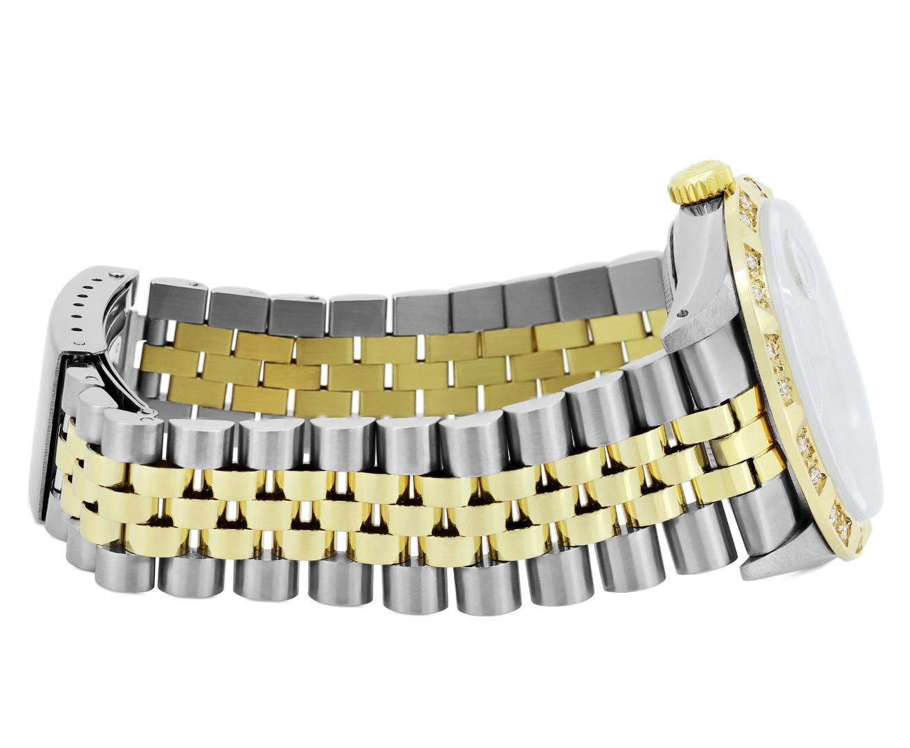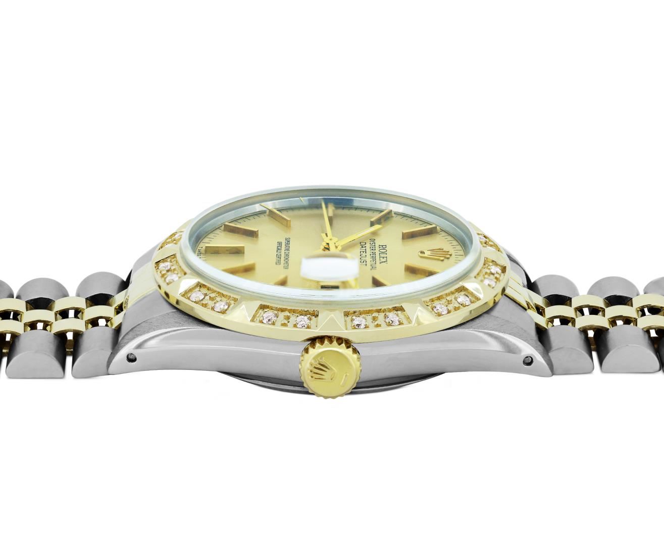 One Mens Pre Owned Yellow Gold And Steel Two Tone Rolex Datejust Polished, Serviced & Electronically Tested, Rolex Yellow Gold & Stainless Steel Case: 36mm, Rolex Yellow Gold Crown, Custom Bezel: New 18K Yellow Gold Pyramid Diamond Bezel, Diamond Count: 24 Diamonds On Dial, Total Weight .75 Carat, Clarity: SI-VS, Color: G to H. Custom Crystal: New Sapphire With Magnified Date Window. Custom Hands: New Luminescent Hands. Rolex Movement: Automatic Winding Movement 3035. Rolex Dial: Champagne Dial With Index Hour Markers and Small Track With Lumi Dots. Date Window: 3 O'Clock Position Date Display, Quickset, Model: Quickset Datejust. Condition: G-6 Extra Fine. Rolex Bracelet: Two Tone Yellow Gold & Stainless Steel Jubilee Band. Bright Polish. 7.0 Inch Length, Adjustable. Fold Clasp, With Rolex Logo. This Watch Has Been Serviced Time Tested And Is In Excellent Condition It Is Free Of All Scratches And Dents. This Watch Comes With A Rolex Box.