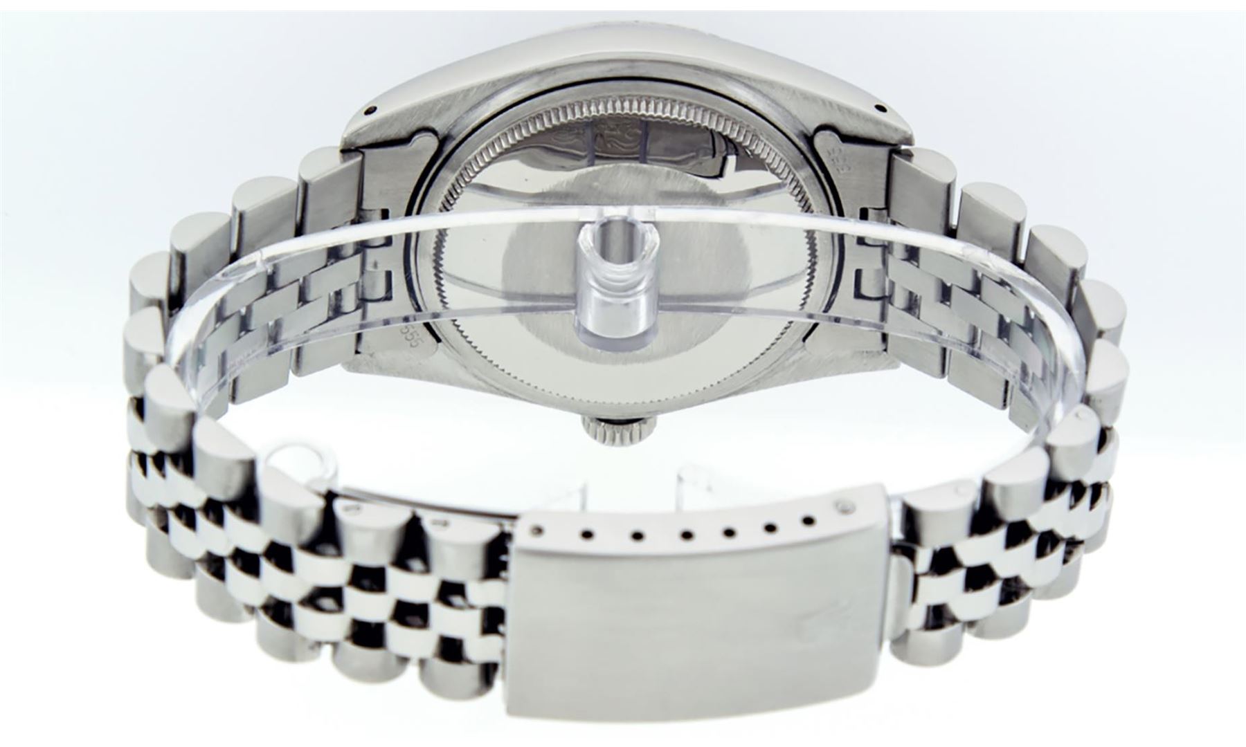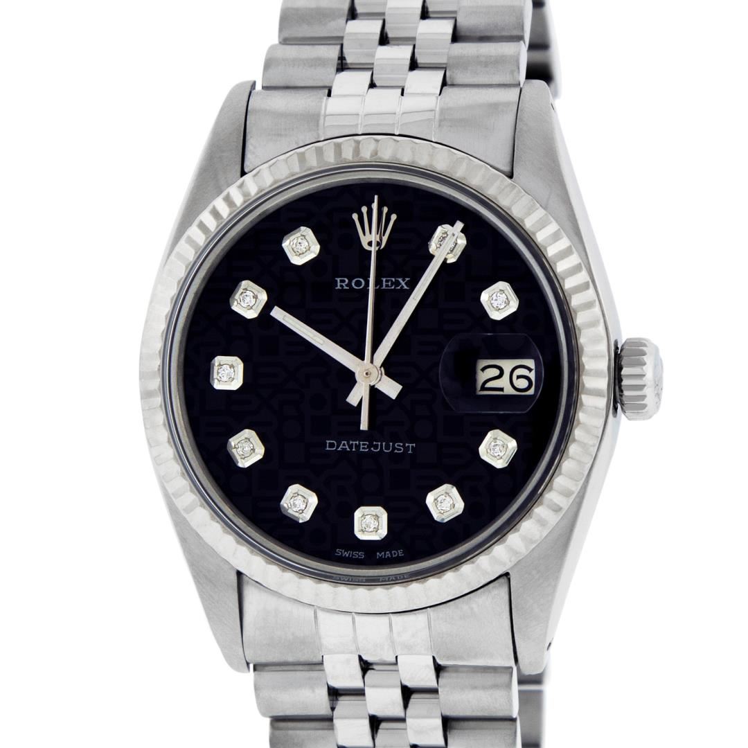 One Mens Pre Owned Stainless Steel Rolex Datejust Polished Bright with Satin Finish, This Watch Has Been Serviced & Electronically Tested, Rolex Stainless Steel Case: 36mm, Rolex Stainless Steel Crown, Rolex Bezel: White Gold Fluted Bezel. Custom Crystal: New Acrylic With Magnified Date Window. Custom Hands: New Luminescent Hands. Rolex Movement: Automatic Winding Movement 3035. Custom Dial: Custom Black Dial With Added Diamond Hour Markers, Diamond Count: 10 Diamonds On Dial. Date Window: 3 O'Clock Position Date Display, Quickset, Model: Datejust, Condition: G-6 Extra Fine. Rolex Bracelet: Stainless Steel Jubilee Band. Bright Polish And Satin Finish. 7.0 Inch Length, Adjustable. Standard Clasp, With Rolex Logo. This Watch Has Been Serviced Time Tested And Is In Excellent Condition It Is Free Of All Scratches And Dents.