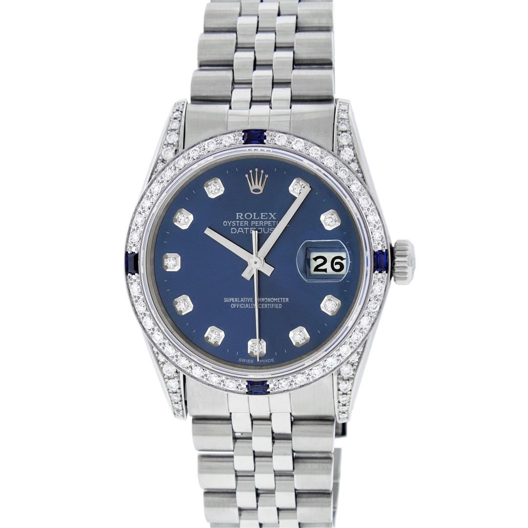 One Pre Owned Stainless Steel 36MM Rolex Datejust Polished Bright with Satin Finish, Serviced & Electronically Tested, Rolex Stainless Steel Case: 36mm, Custom Diamond Lugs: Custom Added 28 Diamonds On Lugs. Rolex Stainless Steel Crown, Custom Bezel: New 18K White Gold Diamond + Sapphire Beadset, Diamond Count: 36 Diamonds + 4 Sapphires. Custom Crystal: New Sapphire With Magnified Date Window. Custom Hands: New Luminescent Hands. Rolex Movement: Automatic Winding Movement 3035. Custom Dial: Custom Blue Dial With Added Diamonds, Stone Count: 10 Diamonds. Date Window: 3 O'Clock Position Date Display, Quickset, Model: Quickset Datejust Condition: G-6 Extra Fine. Rolex Bracelet: Stainless Steel Jubilee Band. Bright Polish & Satin Finish. 7.0 Inch Length, Adjustable. Fold Clasp, With Rolex Logo. This Watch Has Been Serviced And Polished And Its Free Of All Dents And Scratches.