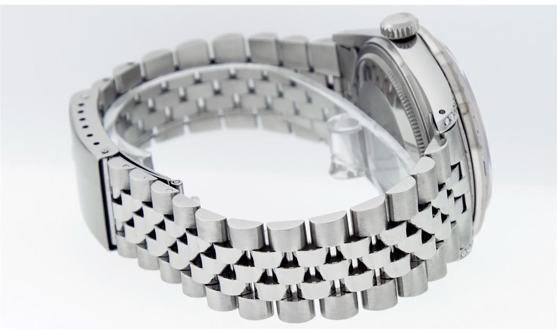 One Pre Owned Stainless Steel 36MM Rolex Datejust Polished Bright with Satin Finish, Serviced & Electronically Tested, Rolex Stainless Steel Case: 36mm, Custom Diamond Lugs: Custom Added 28 Diamonds On Lugs. Rolex Stainless Steel Crown, Custom Bezel: New 18K White Gold Diamond + Sapphire Beadset, Diamond Count: 36 Diamonds + 4 Sapphires. Custom Crystal: New Sapphire With Magnified Date Window. Custom Hands: New Luminescent Hands. Rolex Movement: Automatic Winding Movement 3035. Custom Dial: Custom Blue Dial With Added Diamonds, Stone Count: 10 Diamonds. Date Window: 3 O'Clock Position Date Display, Quickset, Model: Quickset Datejust Condition: G-6 Extra Fine. Rolex Bracelet: Stainless Steel Jubilee Band. Bright Polish & Satin Finish. 7.0 Inch Length, Adjustable. Fold Clasp, With Rolex Logo. This Watch Has Been Serviced And Polished And Its Free Of All Dents And Scratches.