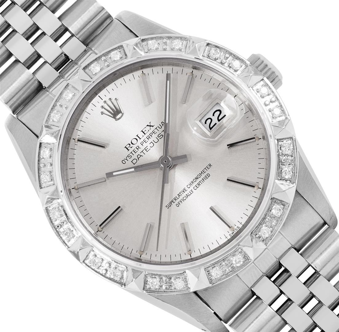 One Mens Pre Owned Rolex Stainless Steel Datejust Polished Bright with Satin Finish, Serviced & Electronically Tested, Rolex Stainless Steel Case: 36mm, Rolex Stainless Steel Crown, Custom Bezel: New 18K White Gold Pyramid Bezel, Diamond Count: 24 Diamond