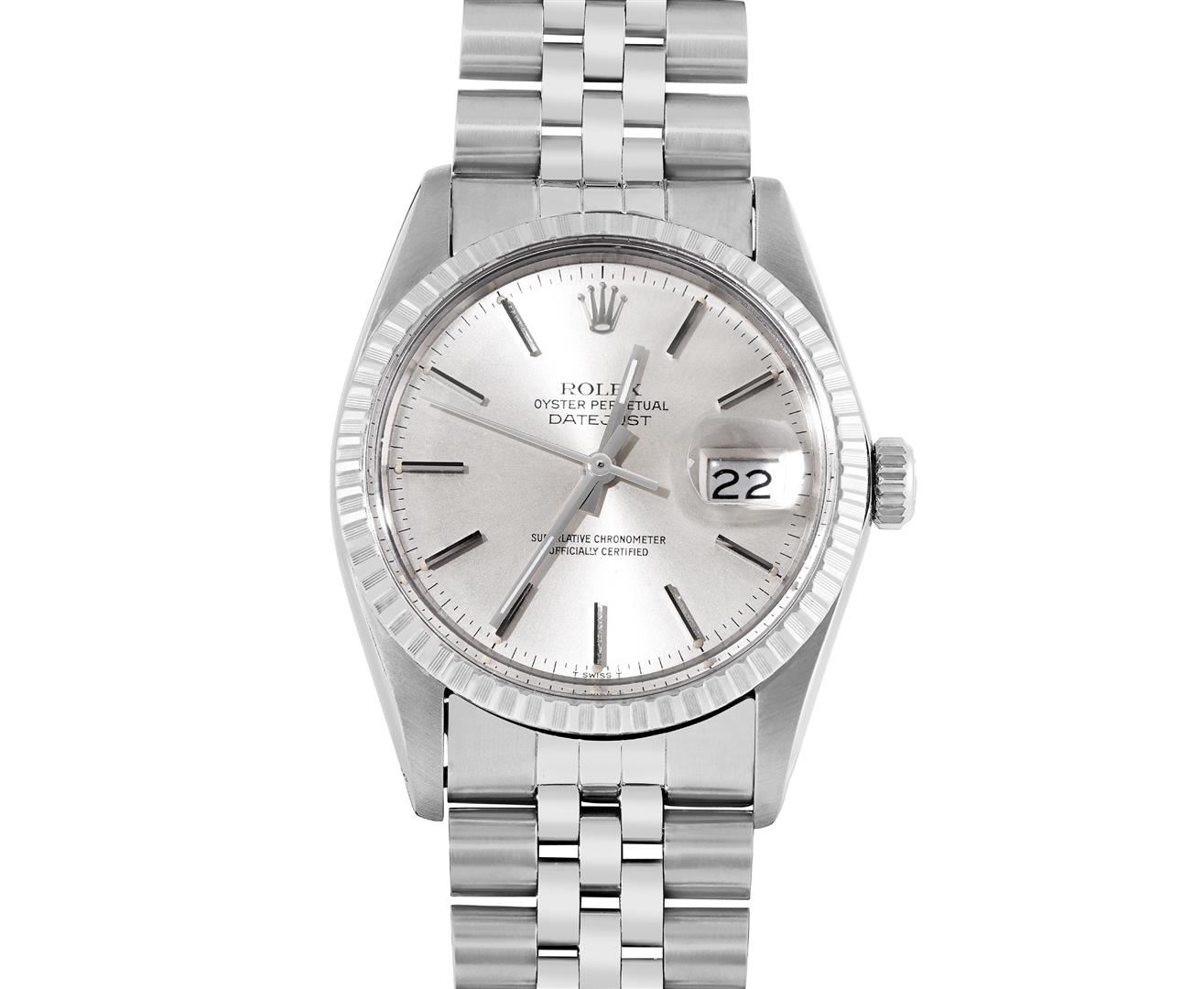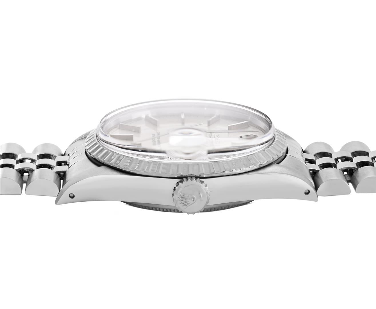 One Mens Pre Owned Rolex Stainless Steel Datejust Polished Bright with Satin Finish, Serviced & Electronically Tested, Rolex Stainless Steel Case: 36mm, Rolex Stainless Steel Crown, Rolex Bezel: Rolex Stainless Steel Engine Turn Bezel. Custom Crystal: New