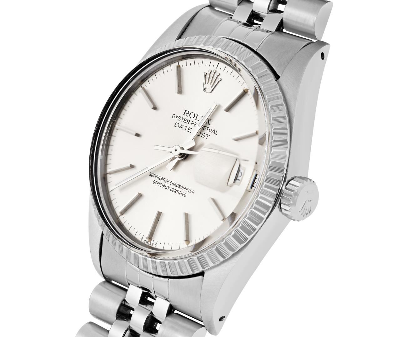 One Mens Pre Owned Rolex Stainless Steel Datejust Polished Bright with Satin Finish, Serviced & Electronically Tested, Rolex Stainless Steel Case: 36mm, Rolex Stainless Steel Crown, Rolex Bezel: Rolex Stainless Steel Engine Turn Bezel. Custom Crystal: New Acrylic Crystal With Magnifying Date Window. Rolex Movement: Automatic Winding Movement Caliber 3035. Rolex Dial: Silver Index With Open Track and Lumi Dots. Custom Hands: New Lumi Hands. Date Window: 3 O'Clock Position Date Display, Quickset, Model: Quickset Datejust. Condition: G-6 Extra Fine. Rolex Bracelet: Stainless Steel Jubilee Band. Bright Polish & Satin Finish. 7.0 Inch Length, Adjustable. Fold Clasp, With Rolex Logo. This Watch Has Been Serviced Time Tested And Is In Excellent Condition It Is Free Of All Scratches And Dents.