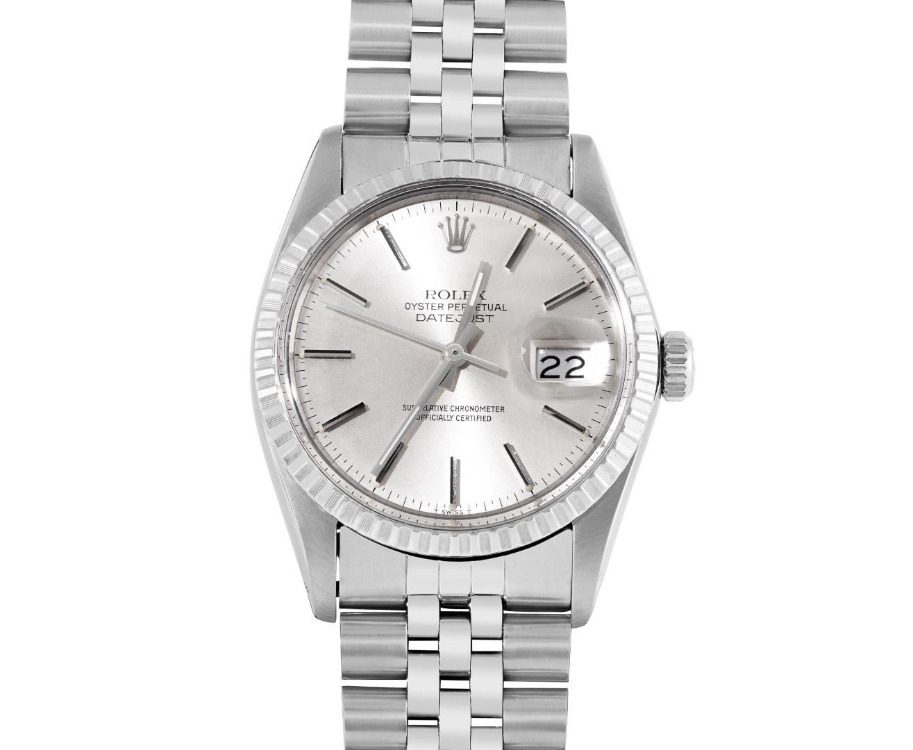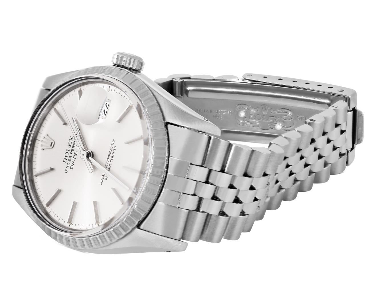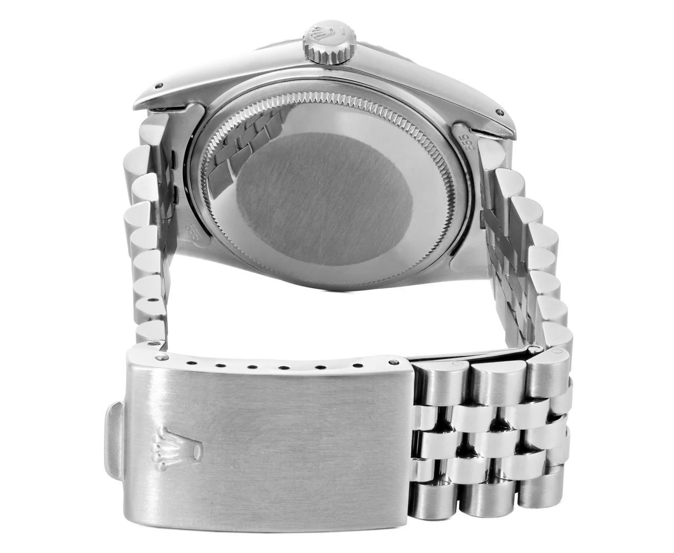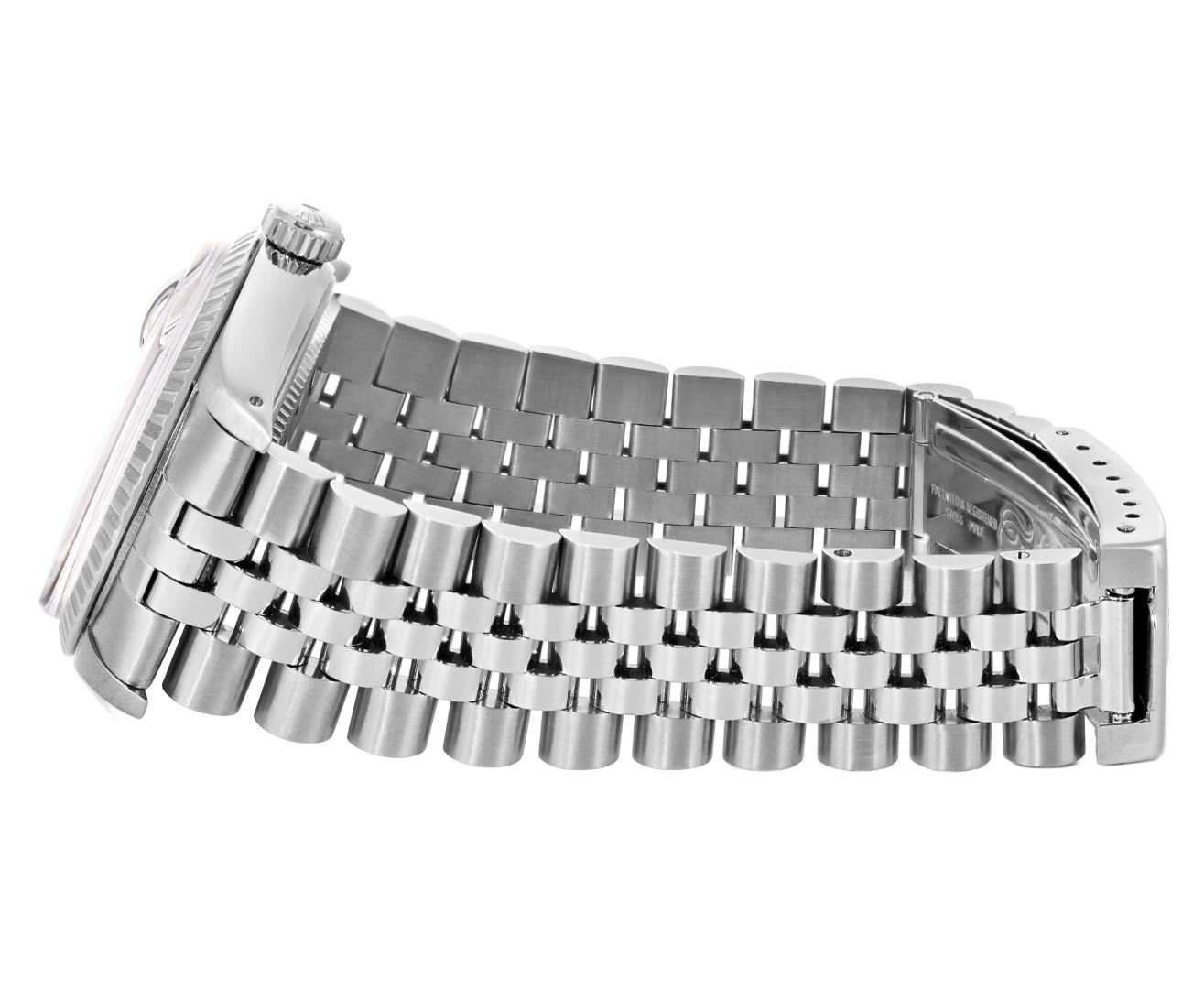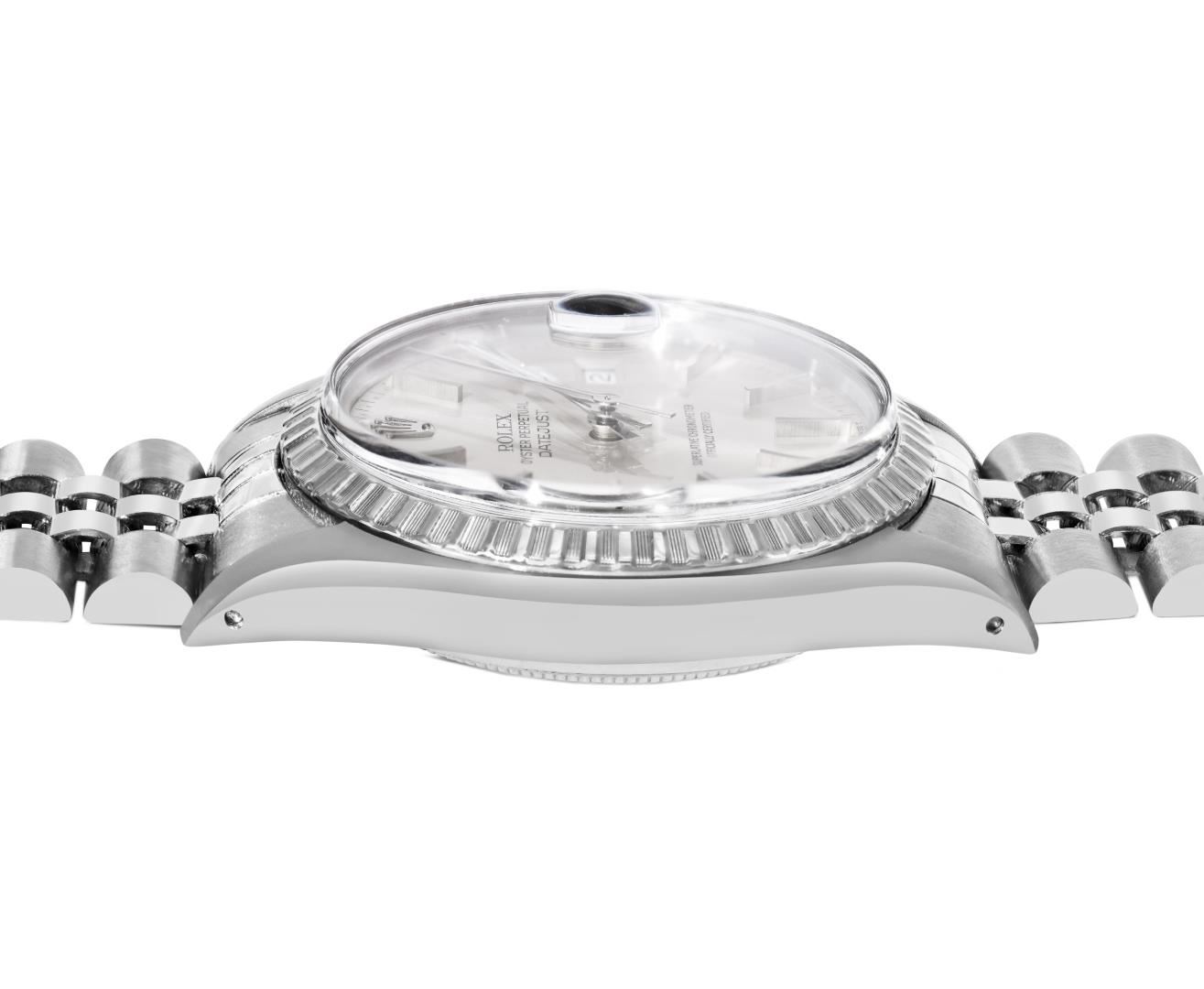 One Mens Pre Owned Rolex Stainless Steel Datejust Polished Bright with Satin Finish, Serviced & Electronically Tested, Rolex Stainless Steel Case: 36mm, Rolex Stainless Steel Crown, Rolex Bezel: Rolex Stainless Steel Engine Turn Bezel. Custom Crystal: New Acrylic Crystal With Magnifying Date Window. Rolex Movement: Automatic Winding Movement Caliber 3035. Rolex Dial: Silver Index With Open Track and Lumi Dots. Custom Hands: New Lumi Hands. Date Window: 3 O'Clock Position Date Display, Quickset, Model: Quickset Datejust. Condition: G-6 Extra Fine. Rolex Bracelet: Stainless Steel Jubilee Band. Bright Polish & Satin Finish. 7.0 Inch Length, Adjustable. Fold Clasp, With Rolex Logo. This Watch Has Been Serviced Time Tested And Is In Excellent Condition It Is Free Of All Scratches And Dents.