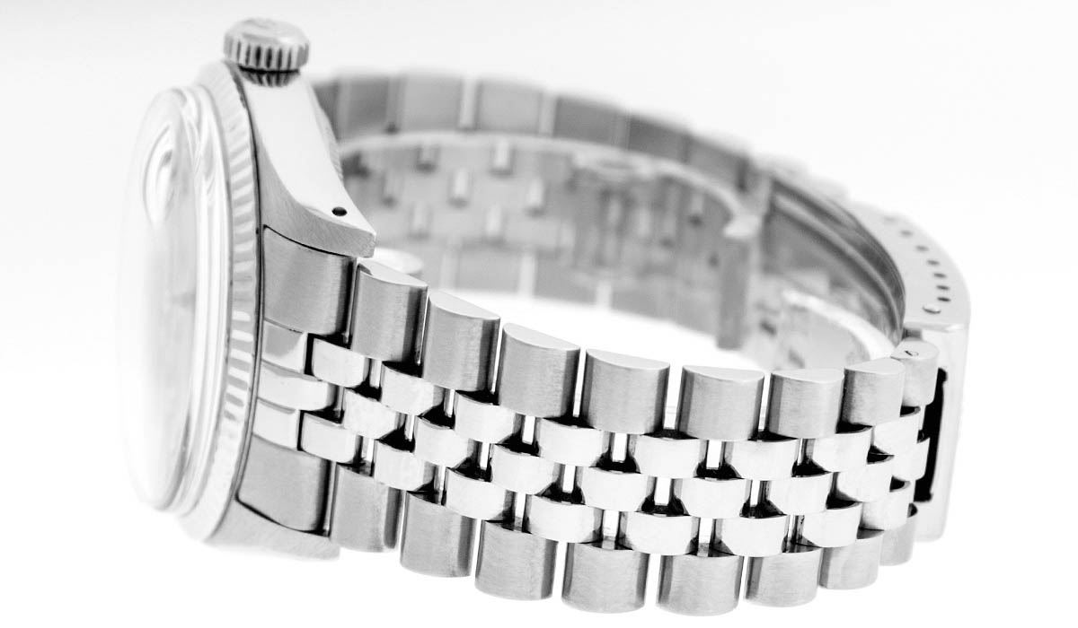 One Gents Rolex Datejust Polished Bright with Satin Finish, Serviced & Electronically Tested, Stainless Steel Case:36mm, Stainless Steel Crown, Bezel: 14K White Gold Fluted Bezel. Custom Crystal: Acrylic Cyclops Lens. Movement: Automatic Winding Movement Caliber 3035. Custom Dial: Black Baguette Diamond 8 + 2 Emerald Dial, Stone Count: 8 Baguette Diamonds in Dial + 2 Emerald Baguettes G To H In Color, Si-VS Clarity. Date Window: 3 O'Clock Position Date Display, Quickset, Model: Datejust, Condition: G-6 Extra Fine. Bracelet:Stainless Steel Jubilee. Bright Polish & Satin Finish. 7.0 Inch Length, Adjustable. Standard Clasp, With Rolex Logo. Watch Has Been Serviced And Polished It Is Free Of All Scratches And Dents.