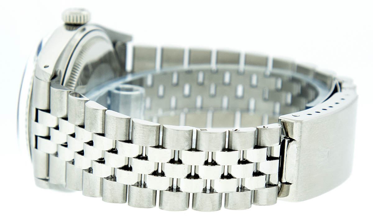 One Gents Rolex Datejust Polished Bright with Satin Finish, Serviced & Electronically Tested, Stainless Steel Case:36mm, Stainless Steel Crown, Bezel: 14K White Gold Fluted Bezel. Custom Crystal: Acrylic Cyclops Lens. Movement: Automatic Winding Movement Caliber 3035. Custom Dial: Black Baguette Diamond 8 + 2 Ruby, Stone Count: 8 Baguette Diamonds in Dial + 2 Ruby Baguettes G To H In Color, Si-VS Clarity. Date Window: 3 O'Clock Position Date Display, Quickset, Model: Datejust, Condition: G-6 Extra Fine. Bracelet:Stainless Steel Jubilee. Bright Polish & Satin Finish. 7.0 Inch Length, Adjustable. Standard Clasp, With Rolex Logo. Watch Has Been Serviced And Polished It Is Free Of All Scratches And Dents.