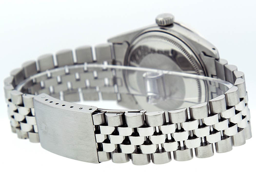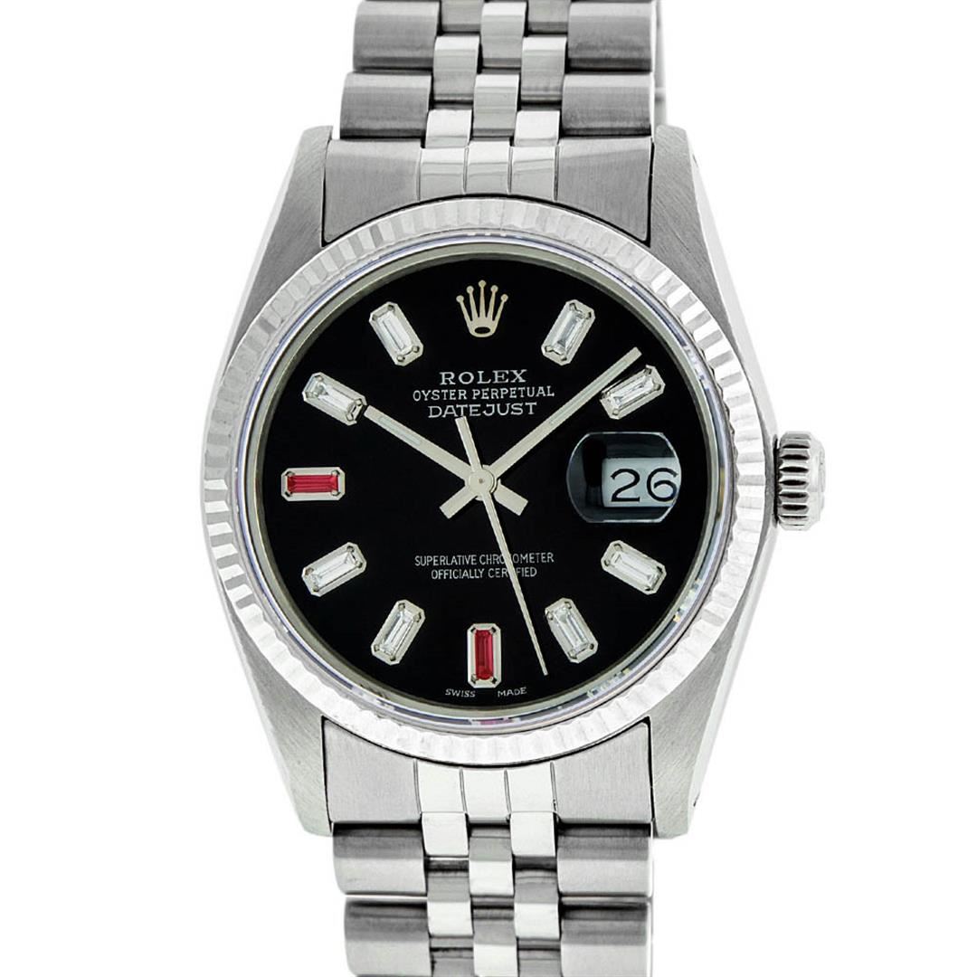 One Gents Rolex Datejust Polished Bright with Satin Finish, Serviced & Electronically Tested, Stainless Steel Case:36mm, Stainless Steel Crown, Bezel: 14K White Gold Fluted Bezel. Custom Crystal: Acrylic Cyclops Lens. Movement: Automatic Winding Movement Caliber 3035. Custom Dial: Black Baguette Diamond 8 + 2 Ruby, Stone Count: 8 Baguette Diamonds in Dial + 2 Ruby Baguettes G To H In Color, Si-VS Clarity. Date Window: 3 O'Clock Position Date Display, Quickset, Model: Datejust, Condition: G-6 Extra Fine. Bracelet:Stainless Steel Jubilee. Bright Polish & Satin Finish. 7.0 Inch Length, Adjustable. Standard Clasp, With Rolex Logo. Watch Has Been Serviced And Polished It Is Free Of All Scratches And Dents.
