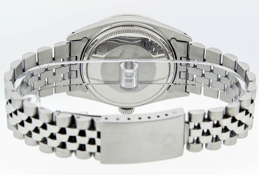 One Gents Rolex Datejust Polished Bright with Satin Finish, Serviced & Electronically Tested, Stainless Steel Case:36mm, Stainless Steel Crown, Bezel: 14K White Gold Fluted Bezel. Custom Crystal: Acrylic Cyclops Lens. Movement: Automatic Winding Movement Caliber 3035. Custom Dial: Black Diamond Dial With Line Track, Diamond Count: 10 Diamond in Dial G To H In Color, Si-VS Clarity. Date Window: 3 O'Clock Position Date Display, Quickset, Model: Datejust, Condition: G-6 Extra Fine. Bracelet:Stainless Steel Jubilee. Bright Polish & Satin Finish. 7.0 Inch Length, Adjustable. Standard Clasp, With Rolex Logo.