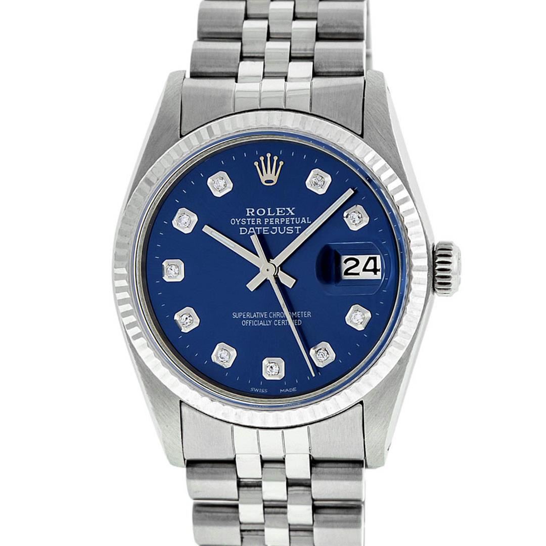 One Gents Rolex Datejust Polished Bright with Satin Finish, Serviced & Electronically Tested, Stainless Steel Case:36mm, Stainless Steel Crown, Bezel: 14K White Gold Fluted Bezel. Custom Crystal: Acrylic Cyclops Lens. Movement: Automatic Winding Movement Caliber 3035. Custom Dial: Blue Diamond Dial With Line Track, Diamond Count: 10 Diamond in Dial G To H In Color, Si-VS Clarity. Date Window: 3 O'Clock Position Date Display, Quickset, Model: Datejust, Condition: G-6 Extra Fine. Bracelet:Stainless Steel Jubilee. Bright Polish & Satin Finish. 7.0 Inch Length, Adjustable. Standard Clasp, With Rolex Logo.