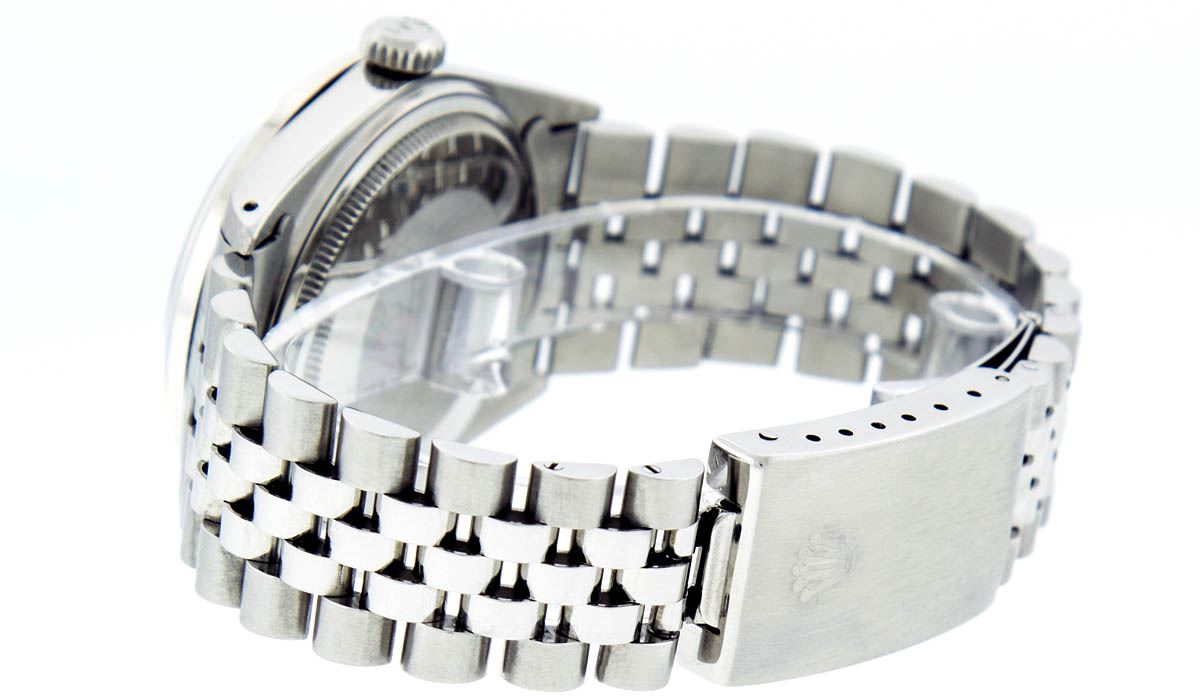 One Gents Rolex Datejust Polished Bright with Satin Finish, Serviced & Electronically Tested, Stainless Steel Case:36mm, Stainless Steel Crown, Bezel: 14K White Gold Fluted Bezel. Custom Crystal: Acrylic Cyclops Lens. Movement: Automatic Winding Movement Caliber 3035. Custom Dial: Dark Rhodium Diamond Dial With Line Track, Diamond Count: 10 Diamond in Dial G To H In Color, Si-VS Clarity. Date Window: 3 O'Clock Position Date Display, Quickset, Model: Datejust, Condition: G-6 Extra Fine. Bracelet:Stainless Steel Jubilee. Bright Polish & Satin Finish. 7.0 Inch Length, Adjustable. Standard Clasp, With Rolex Logo. Watch Has Been Serviced And Polished It Is Free Of All Scratches And Dents.