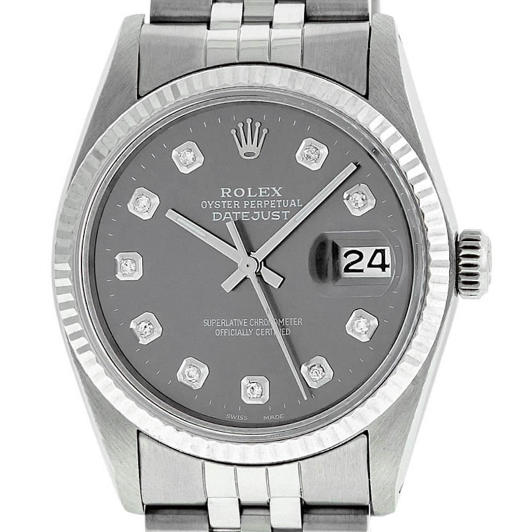 One Gents Rolex Datejust Polished Bright with Satin Finish, Serviced & Electronically Tested, Stainless Steel Case:36mm, Stainless Steel Crown, Bezel: 14K White Gold Fluted Bezel. Custom Crystal: Acrylic Cyclops Lens. Movement: Automatic Winding Movement Caliber 3035. Custom Dial: Dark Rhodium Diamond Dial With Line Track, Diamond Count: 10 Diamond in Dial G To H In Color, Si-VS Clarity. Date Window: 3 O'Clock Position Date Display, Quickset, Model: Datejust, Condition: G-6 Extra Fine. Bracelet:Stainless Steel Jubilee. Bright Polish & Satin Finish. 7.0 Inch Length, Adjustable. Standard Clasp, With Rolex Logo. Watch Has Been Serviced And Polished It Is Free Of All Scratches And Dents.