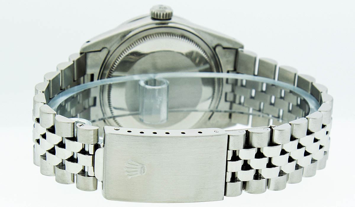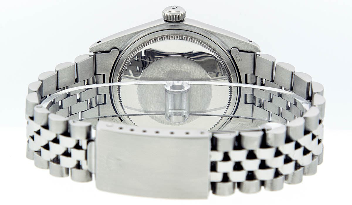 One Gents Rolex Datejust Polished Bright with Satin Finish, Serviced & Electronically Tested, Stainless Steel Case:36mm, Stainless Steel Crown, Original Bezel: 14K White Gold Fluted Bezel. Custom Crystal: Acrylic Cyclops Lens. Movement: Automatic Winding Movement Caliber 3035. Custom Dial: Green Diamond Dial With Line Track, Diamond Count: 10 Diamond in Dial G To H In Color, Si-VS Clarity. Date Window: 3 O'Clock Position Date Display, Quickset, Model: Datejust, Condition: G-6 Extra Fine. Bracelet:Stainless Steel Jubilee. Bright Polish & Satin Finish. 7.0 Inch Length, Adjustable. Standard Clasp, With Rolex Logo.