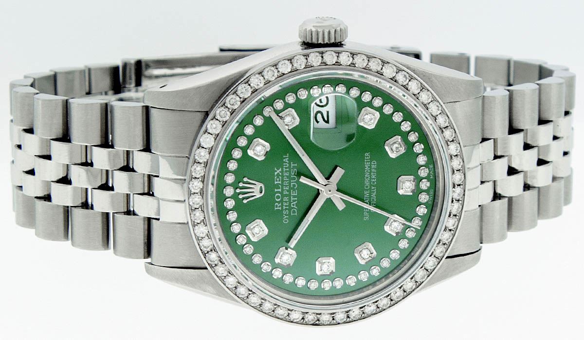 One Mens Rolex Datejust Polished Bright with Satin Finish, Serviced & Electronically Tested, Stainless Steel Case:36mm, Stainless Steel Crown, Custom Bezel: Stainless Steel Beadset Diamond Bezel, Diamond Count: 54 Diamonds Total Weight 1.00 Carat, Clarity: SI-VS, Color: G to H. Custom Crystal: Synthetic Sapphire Cyclops Lens. Movement: Automatic Winding Movement Caliber 3035. Custom Dial: Green String Diamond Dial, Diamond Count: 58 Diamonds In Dial, Color: G to H, Clarity: VS2-SI1. Date Window: 3 O'Clock Position Date Display, Quickset, Model: Datejust. Condition: G-6 Extra Fine. Bracelet:Stainless Steel Jubilee Band. Bright Polish & Satin Finish. 7.0 Inch Length, Adjustable. Standard Clasp, With Rolex Logo. This watch has been serviced time tested and is in excellent condition it is free of all scratches and dents.