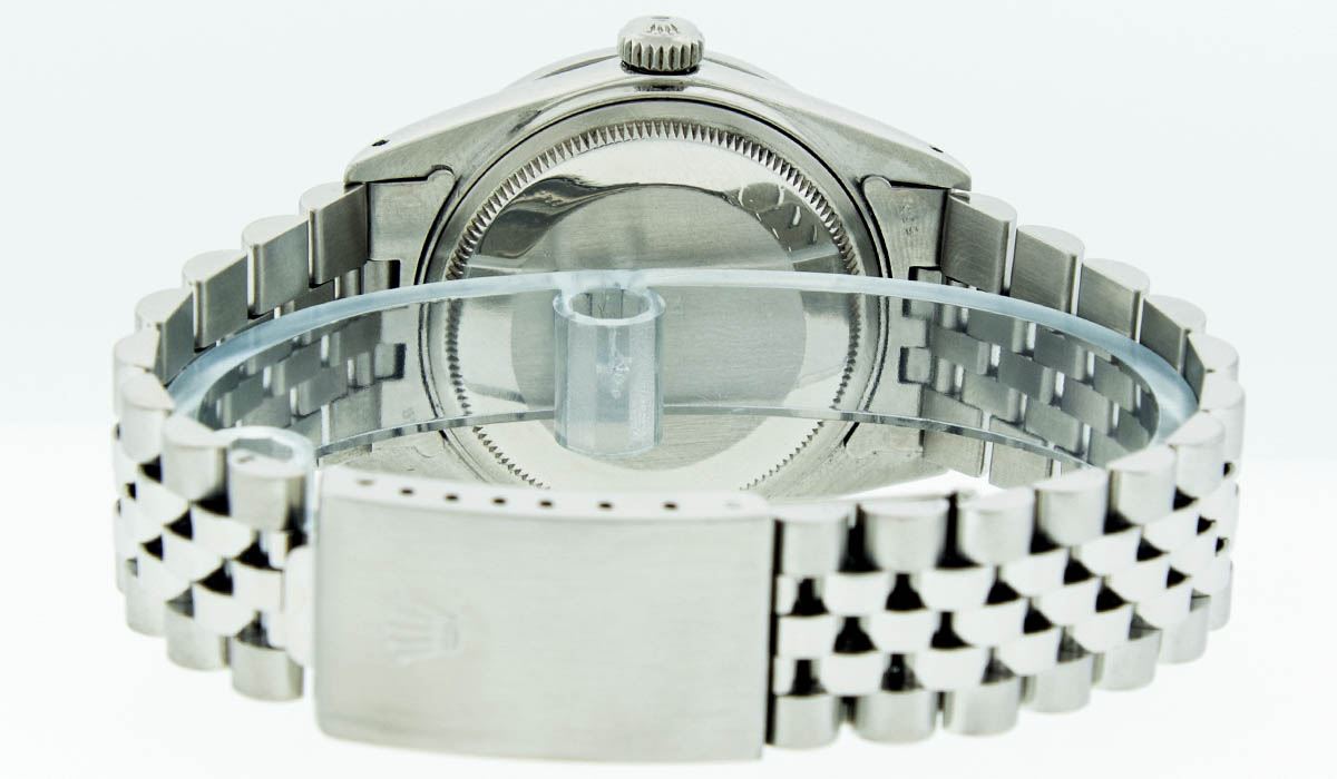 One Gents Rolex Datejust Polished Bright with Satin Finish, Serviced & Electronically Tested, Stainless Steel Case:36mm, Stainless Steel Crown, Original Bezel: 14K White Gold Fluted Bezel. Custom Crystal: Acrylic Cyclops Lens. Movement: Automatic Winding Movement Caliber 3035. Custom Dial: Ice Blue Diamond Dial, Diamond Count: 10 Diamond in Dial G To H In Color, Si-VS Clarity. Date Window: 3 O'Clock Position Date Display, Quickset, Model: Datejust, Condition: G-6 Extra Fine. Bracelet:Stainless Steel Jubilee. Bright Polish & Satin Finish. 7.0 Inch Length, Adjustable. Standard Clasp, With Rolex Logo.