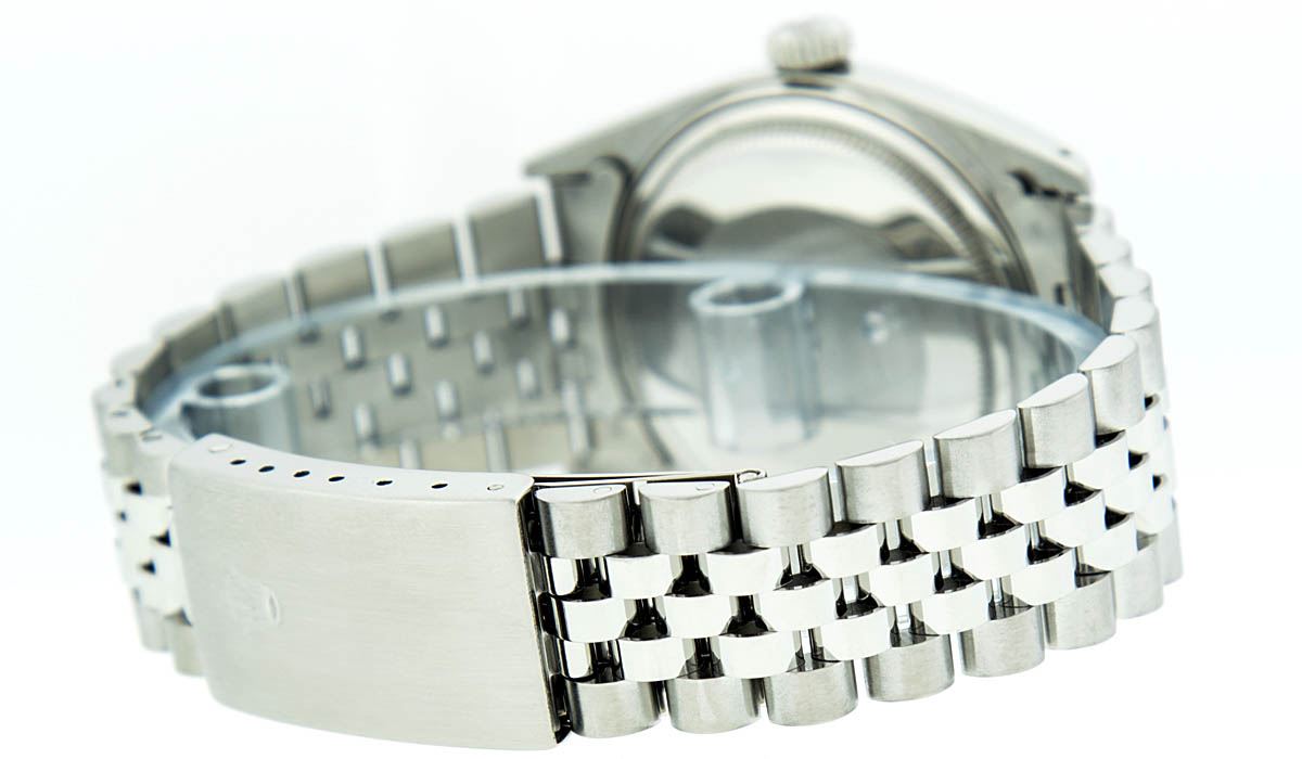 One Gents Rolex Datejust Polished Bright with Satin Finish, Serviced & Electronically Tested, Stainless Steel Case:36mm, Stainless Steel Crown, Original Bezel: 14K White Gold Fluted Bezel. Custom Crystal: Acrylic Cyclops Lens. Movement: Automatic Winding Movement Caliber 3035. Custom Dial: Ice Blue Diamond Dial, Diamond Count: 10 Diamond in Dial G To H In Color, Si-VS Clarity. Date Window: 3 O'Clock Position Date Display, Quickset, Model: Datejust, Condition: G-6 Extra Fine. Bracelet:Stainless Steel Jubilee. Bright Polish & Satin Finish. 7.0 Inch Length, Adjustable. Standard Clasp, With Rolex Logo.