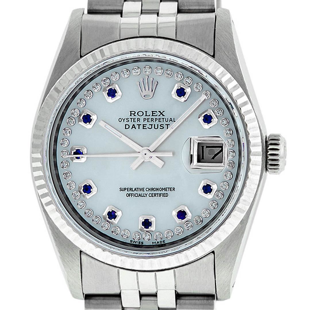 One Gents Rolex Datejust Polished Bright with Satin Finish, Serviced & Electronically Tested, Stainless Steel Case: 36mm, Stainless Steel Crown, Bezel: 14K White Gold Fluted Bezel. Custom Crystal: Acrylic Cyclops Lens. Movement: Automatic Winding Movement Caliber 3035. Custom Dial: Mother Of Pearl Sapphire String Diamond Dial, Stone Count: 10 Sapphires + 48 Diamond in Dial G To H In Color, Si-VS Clarity. Date Window: 3 O'Clock Position Date Display, Quickset, Model: Datejust, Condition: G-6 Extra Fine. Bracelet:Stainless Steel Jubilee. Bright Polish & Satin Finish. 7.0 Inch Length, Adjustable. Standard Clasp, With Rolex Logo.