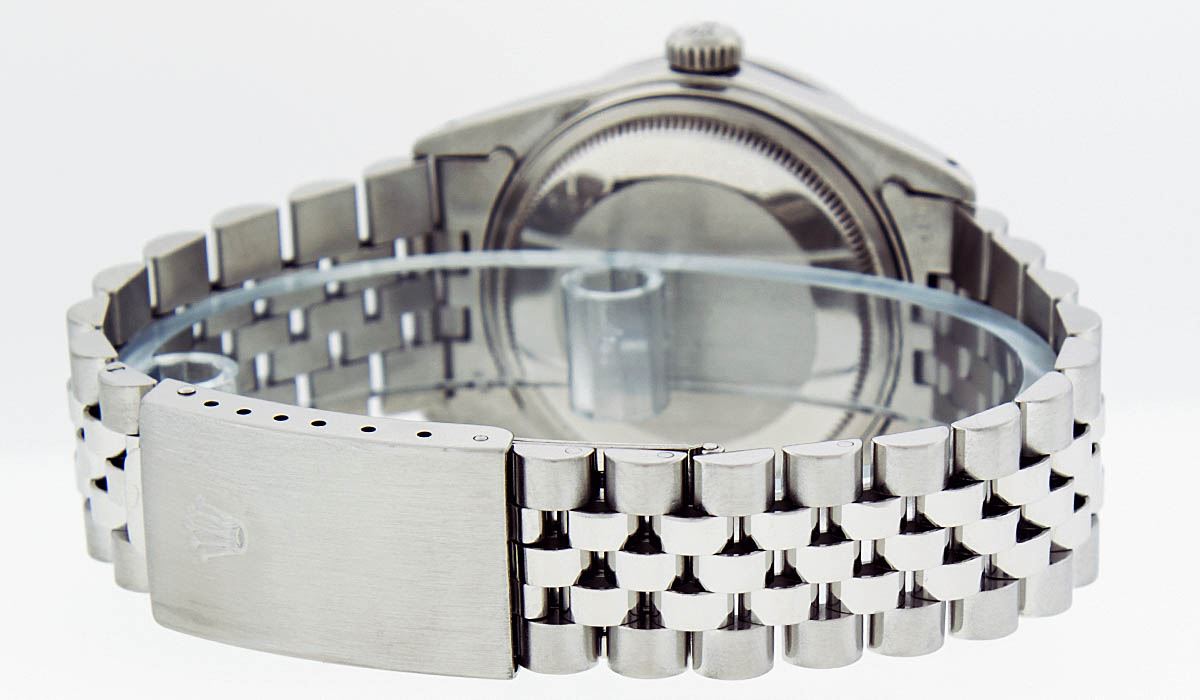 One Gents Rolex Datejust Polished Bright with Satin Finish, Serviced & Electronically Tested, Stainless Steel Case: 36mm, Stainless Steel Crown, Bezel: 14K White Gold Fluted Bezel. Custom Crystal: Acrylic Cyclops Lens. Movement: Automatic Winding Movement Caliber 3035. Custom Dial: Mother Of Pearl Sapphire String Diamond Dial, Stone Count: 10 Sapphires + 48 Diamond in Dial G To H In Color, Si-VS Clarity. Date Window: 3 O'Clock Position Date Display, Quickset, Model: Datejust, Condition: G-6 Extra Fine. Bracelet:Stainless Steel Jubilee. Bright Polish & Satin Finish. 7.0 Inch Length, Adjustable. Standard Clasp, With Rolex Logo.