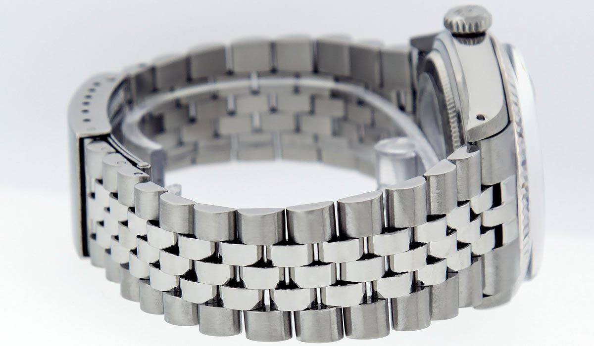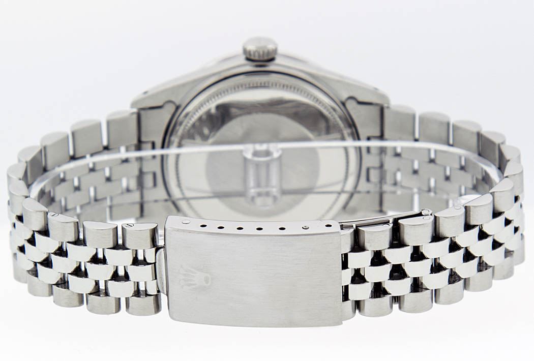 One Gents Rolex Datejust Polished Bright with Satin Finish, Serviced & Electronically Tested, Stainless Steel Case:36mm, Stainless Steel Crown, Bezel: 14K White Gold Fluted Bezel. Custom Crystal: Acrylic Cyclops Lens. Movement: Automatic Winding Movement Caliber 3035. Custom Dial: Meteorite Diamond Dial, Diamond Count: 10 Diamond in Dial G To H In Color, Si-VS Clarity. Date Window: 3 O'Clock Position Date Display, Quickset, Model: Datejust, Condition: G-6 Extra Fine. Bracelet:Stainless Steel Jubilee. Bright Polish & Satin Finish. 7.0 Inch Length, Adjustable. Standard Clasp, With Rolex Logo.