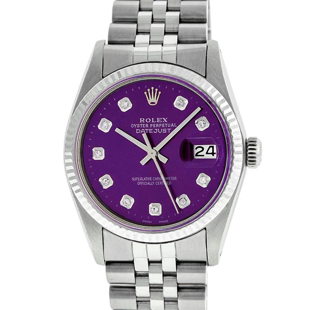 One Gents Rolex Datejust Polished Bright with Satin Finish, Serviced & Electronically Tested, Stainless Steel Case:36mm, Stainless Steel Crown, Original Bezel: 14K White Gold Fluted Bezel. Custom Crystal: Acrylic Cyclops Lens. Movement: Automatic Winding Movement Caliber 3035. Custom Dial: Purple Diamond Dial With Line Track, Diamond Count: 10 Diamond in Dial G To H In Color, Si-VS Clarity. Date Window: 3 O'Clock Position Date Display, Quickset, Model: Datejust, Condition: G-6 Extra Fine. Bracelet:Stainless Steel Jubilee. Bright Polish & Satin Finish. 7.0 Inch Length, Adjustable. Standard Clasp, With Rolex Logo.