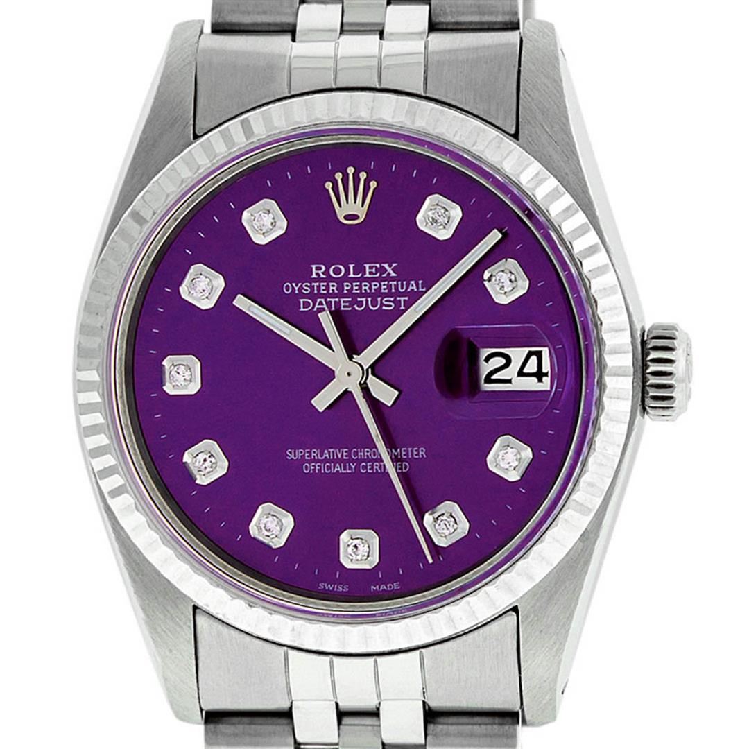 One Gents Rolex Datejust Polished Bright with Satin Finish, Serviced & Electronically Tested, Stainless Steel Case:36mm, Stainless Steel Crown, Original Bezel: 14K White Gold Fluted Bezel. Custom Crystal: Acrylic Cyclops Lens. Movement: Automatic Winding Movement Caliber 3035. Custom Dial: Purple Diamond Dial With Line Track, Diamond Count: 10 Diamond in Dial G To H In Color, Si-VS Clarity. Date Window: 3 O'Clock Position Date Display, Quickset, Model: Datejust, Condition: G-6 Extra Fine. Bracelet:Stainless Steel Jubilee. Bright Polish & Satin Finish. 7.0 Inch Length, Adjustable. Standard Clasp, With Rolex Logo.