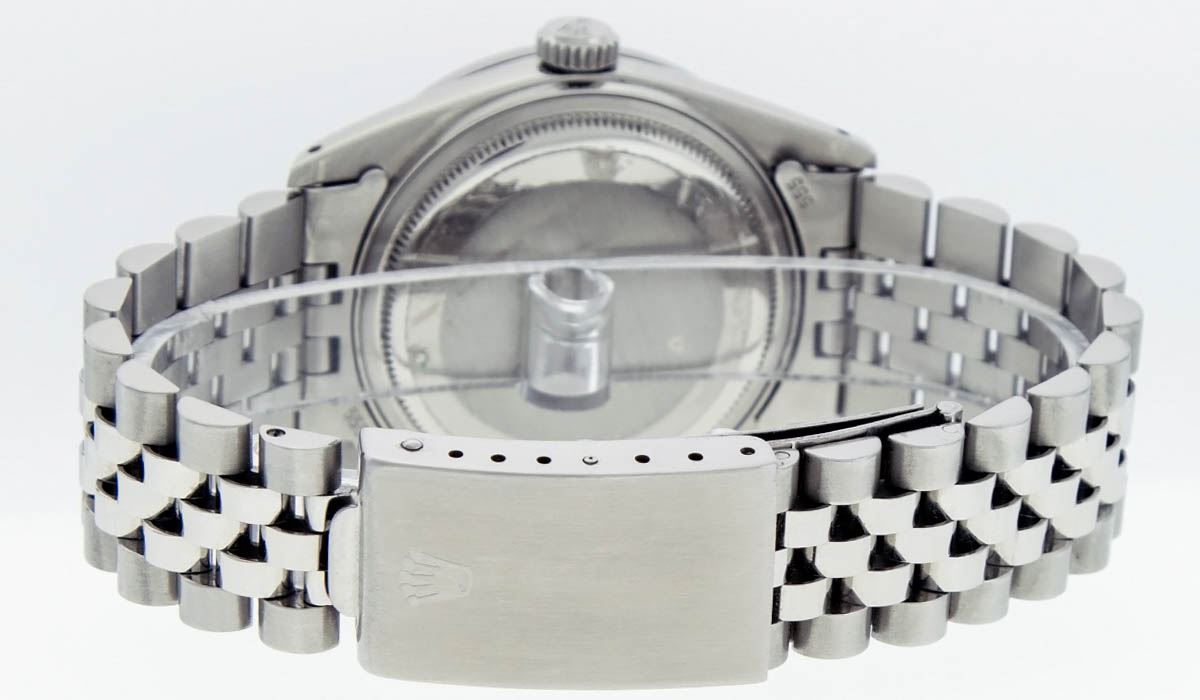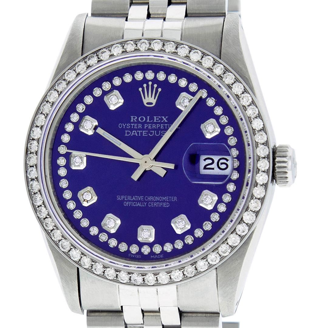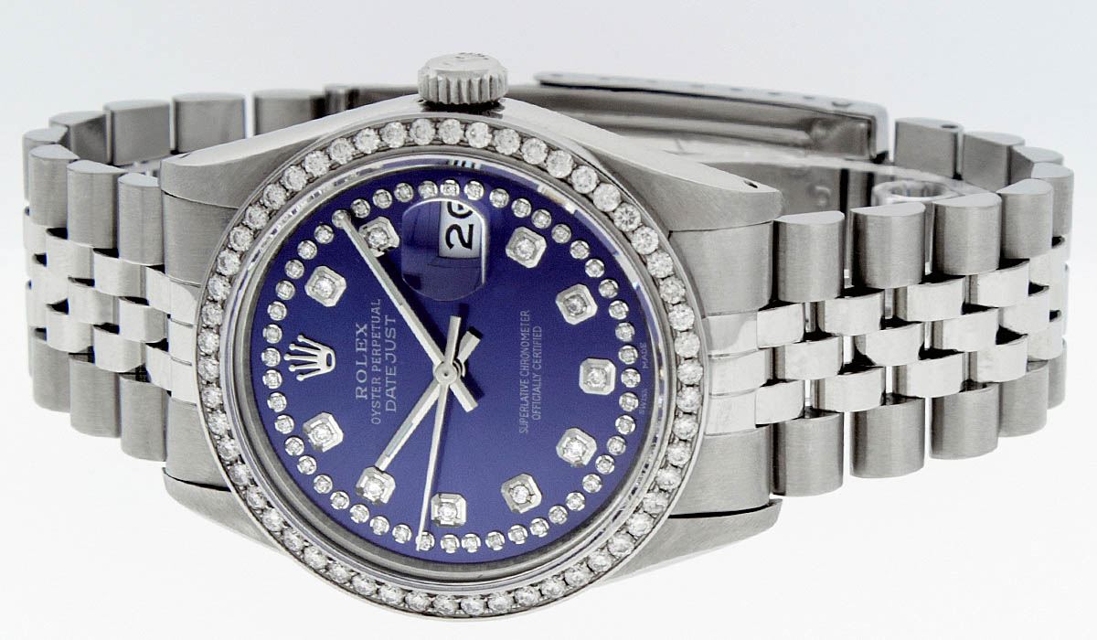 One Mens Rolex Datejust Polished Bright with Satin Finish, Serviced & Electronically Tested, Stainless Steel Case:36mm, Stainless Steel Crown, Custom Bezel: Stainless Steel Beadset Diamond Bezel, Diamond Count: 54 Diamonds Total Weight 1.00 Carat, Clarity: SI-VS, Color: G to H. Custom Crystal: Synthetic Sapphire Cyclops Lens. Movement: Automatic Winding Movement Caliber 3035. Custom Dial: Purple String Diamond Dial, Diamond Count: 58 Diamonds In Dial, Color: G to H, Clarity: VS2-SI1. Date Window: 3 O'Clock Position Date Display, Quickset, Model: Datejust. Condition: G-6 Extra Fine. Bracelet:Stainless Steel Jubilee Band. Bright Polish & Satin Finish. 7.0 Inch Length, Adjustable. Standard Clasp, With Rolex Logo. This watch has been serviced time tested and is in excellent condition it is free of all scratches and dents.
