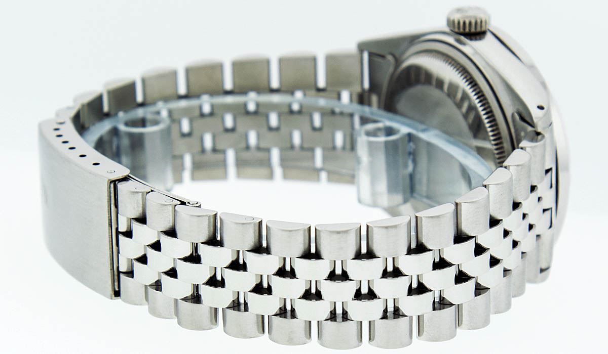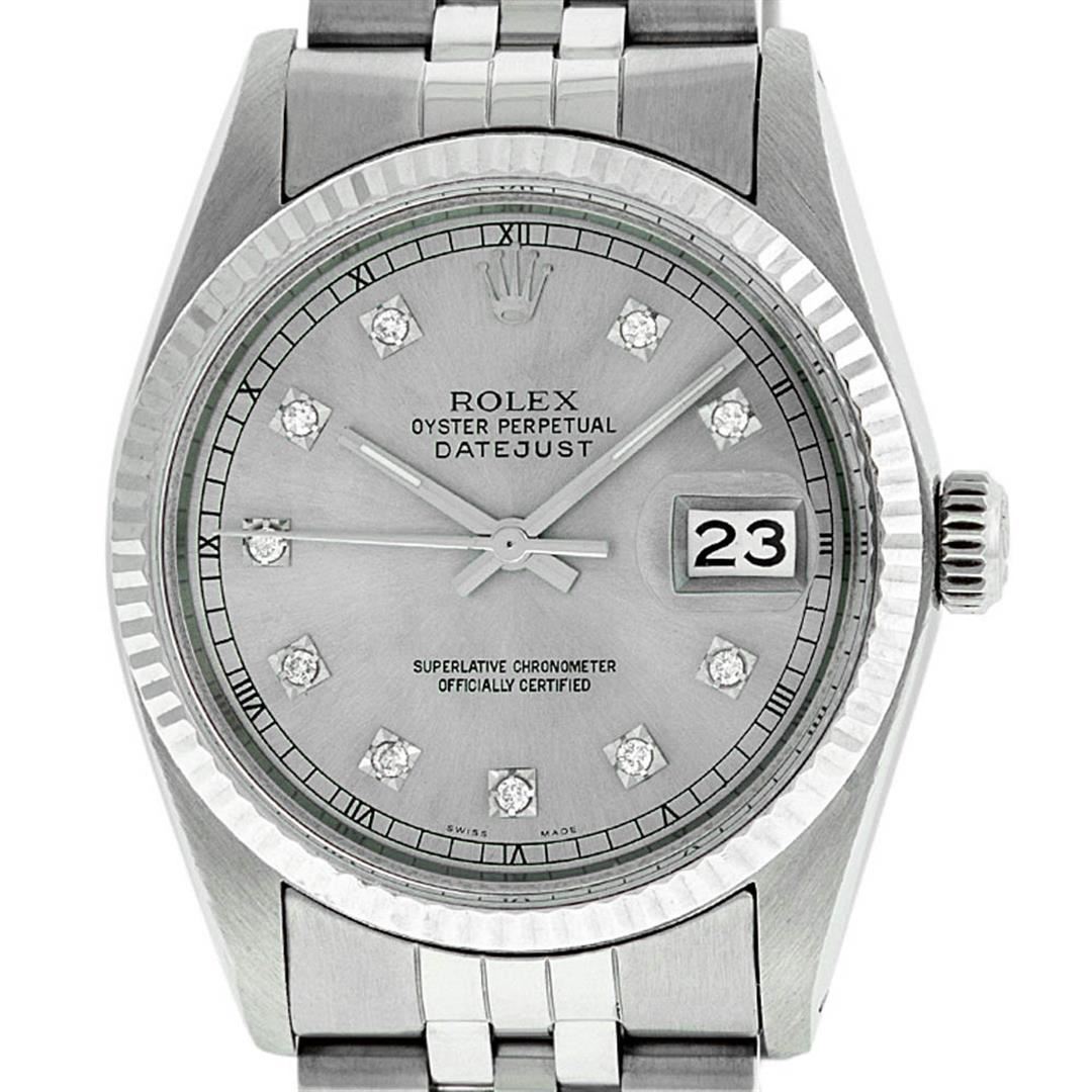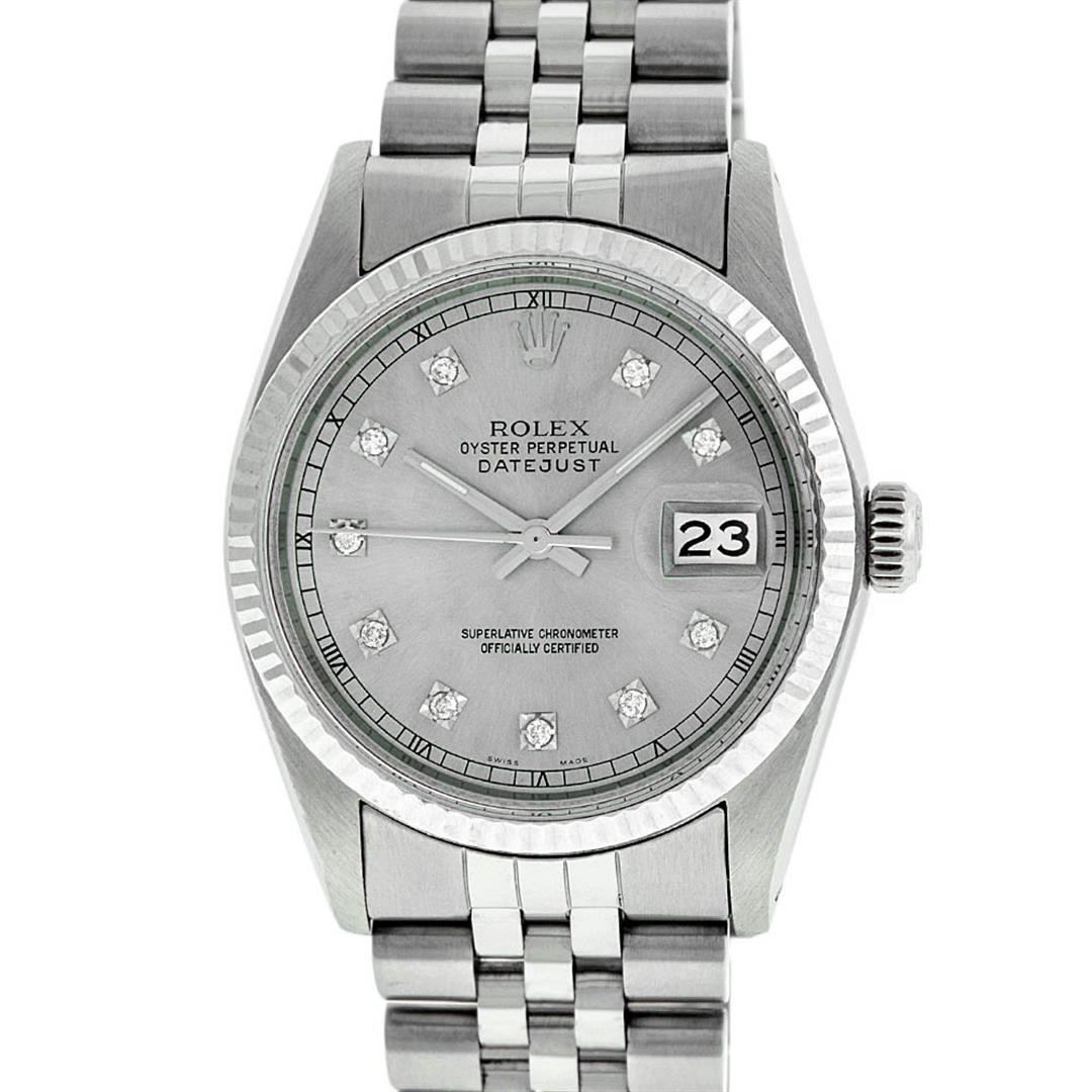 One Gents Rolex Datejust Polished Bright with Satin Finish, Serviced & Electronically Tested, Stainless Steel Case:36mm, Stainless Steel Crown, Bezel: 14K White Gold Fluted Bezel. Custom Crystal: Acrylic Cyclops Lens. Movement: Automatic Winding Movement Caliber 3035. Custom Dial: Silver Diamond Dial With Square Roman Track, Diamond Count: 10 Diamond in Dial G To H In Color, Si-VS Clarity. Date Window: 3 O'Clock Position Date Display, Quickset, Model: Datejust, Condition: G-6 Extra Fine. Bracelet:Stainless Steel Jubilee. Bright Polish & Satin Finish. 7.0 Inch Length, Adjustable. Standard Clasp, With Rolex Logo. Watch Has Been Serviced And Polished It Is Free Of All Scratches And Dents.