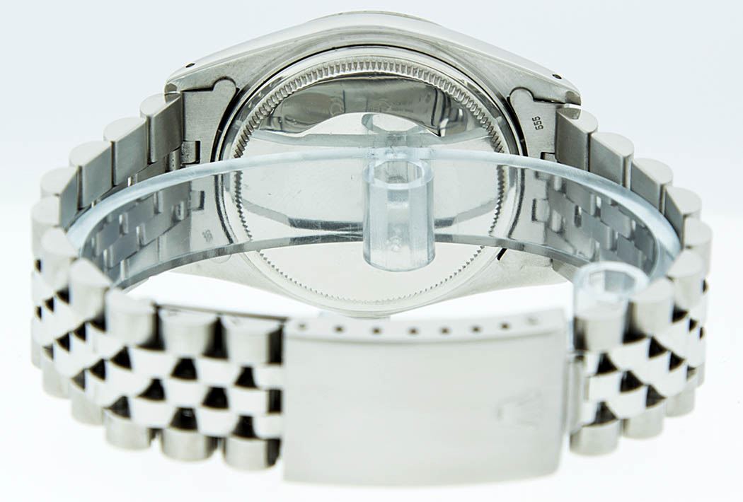 One Gents Rolex Datejust Polished Bright with Satin Finish, Serviced & Electronically Tested, Stainless Steel Case:36mm, Stainless Steel Crown, Bezel: 14K White Gold Fluted Bezel. Custom Crystal: Acrylic Cyclops Lens. Movement: Automatic Winding Movement Caliber 3035. Custom Dial: Silver Diamond Dial With Square Roman Track, Diamond Count: 10 Diamond in Dial G To H In Color, Si-VS Clarity. Date Window: 3 O'Clock Position Date Display, Quickset, Model: Datejust, Condition: G-6 Extra Fine. Bracelet:Stainless Steel Jubilee. Bright Polish & Satin Finish. 7.0 Inch Length, Adjustable. Standard Clasp, With Rolex Logo. Watch Has Been Serviced And Polished It Is Free Of All Scratches And Dents.
