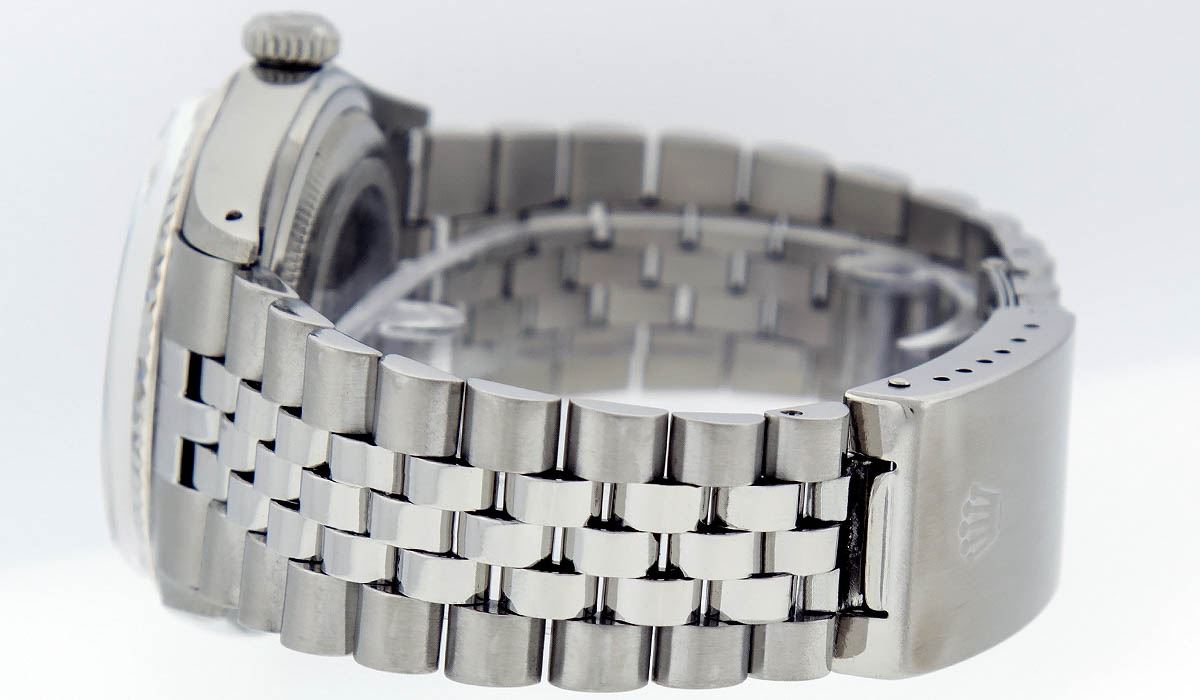One Gents Rolex Datejust Polished Bright with Satin Finish, Serviced & Electronically Tested, Stainless Steel Case:36mm, Stainless Steel Crown, Bezel: 14K White Gold Fluted Bezel. Custom Crystal: Acrylic Cyclops Lens. Movement: Automatic Winding Movement Caliber 3035. Custom Dial: Silver Diamond Dial With Square Roman Track, Diamond Count: 10 Diamond in Dial G To H In Color, Si-VS Clarity. Date Window: 3 O'Clock Position Date Display, Quickset, Model: Datejust, Condition: G-6 Extra Fine. Bracelet:Stainless Steel Jubilee. Bright Polish & Satin Finish. 7.0 Inch Length, Adjustable. Standard Clasp, With Rolex Logo. Watch Has Been Serviced And Polished It Is Free Of All Scratches And Dents.