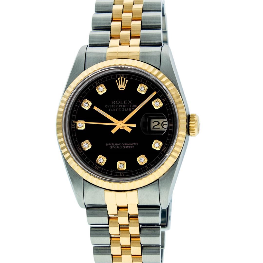 One Gents Two Tone Rolex Datejust Polished, Serviced & Electronically Tested, 14K Yellow Gold & Stainless Steel Case: 36mm, 14K Yellow Gold Crown, Bezel: 18K Yellow Gold Fluted Bezel. Custom Crystal: Acrylic Cyclops Lens. Movement: Automatic Winding Movement Caliber 3035. Custom Dial: Black Dial Set With Diamond Hour Markers And Square Roman Track, Diamond Count: 10 Diamonds in Dial G To H In Color, Si-VS Clarity. Date Window: 3 O'Clock Position Date Display, Quickset, Model: 16013 Condition: G-6 Extra Fine. Bracelet:Two Tone 14K Yellow Gold & Stainless Steel Jubilee. Bright Polish. 7.0 Inch Length, Adjustable. Standard Clasp, With Rolex Logo. Watch Has Been Serviced And Polished It Is Free Of All Scratches And Dents.