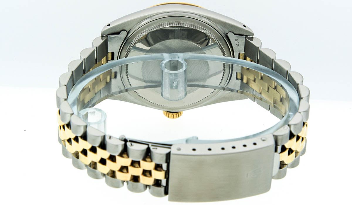 One Gents Two Tone Rolex Datejust Polished, Serviced & Electronically Tested, 14K Yellow Gold & Stainless Steel Case: 36mm, 14K Yellow Gold Crown, Bezel: 18K Yellow Gold Fluted Bezel. Custom Crystal: Acrylic Cyclops Lens. Movement: Automatic Winding Movement Caliber 3035. Custom Dial: Blue Vignette Dial Set With Diamond Hour Markers And Square Roman Track, Diamond Count: 10 Diamonds in Dial G To H In Color, Si-VS Clarity. Date Window: 3 O'Clock Position Date Display, Quickset, Model: 16013 Condition: G-6 Extra Fine. Bracelet:Two Tone 14K Yellow Gold & Stainless Steel Jubilee. Bright Polish. 7.0 Inch Length, Adjustable. Standard Clasp, With Rolex Logo. Watch Has Been Serviced And Polished It Is Free Of All Scratches And Dents. Watch Has Been Serviced And Polished It Is Free Of All Scratches And Dents.