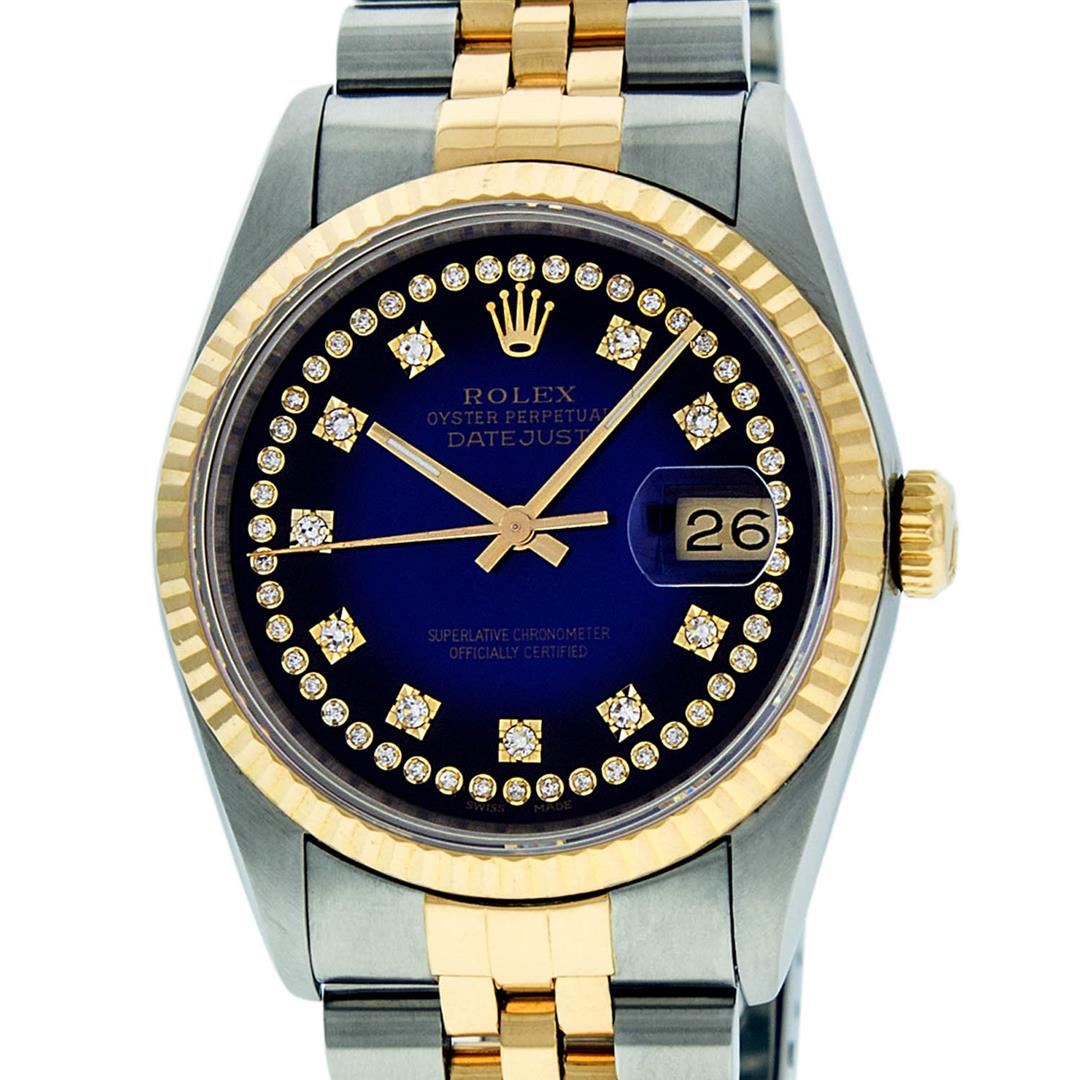 One Gents Two Tone Rolex Datejust Polished, Serviced & Electronically Tested, 14K Yellow Gold & Stainless Steel Case: 36mm, 14K Yellow Gold Crown, Bezel: 18K Yellow Gold Fluted Bezel. Custom Crystal: Acrylic Cyclops Lens. Movement: Automatic Winding Movement Caliber 3035. Custom Dial: Blue Vignette String VS Diamond Dial, Diamond Count: 58 Diamonds in Dial G To H In Color, VS Clarity. Date Window: 3 O'Clock Position Date Display, Quickset, Model: 16013 Condition: G-6 Extra Fine. Bracelet:Two Tone 14K Yellow Gold & Stainless Steel Jubilee. Bright Polish. 7.0 Inch Length, Adjustable. Standard Clasp, With Rolex Logo. Watch Has Been Serviced And Polished It Is Free Of All Scratches And Dents.