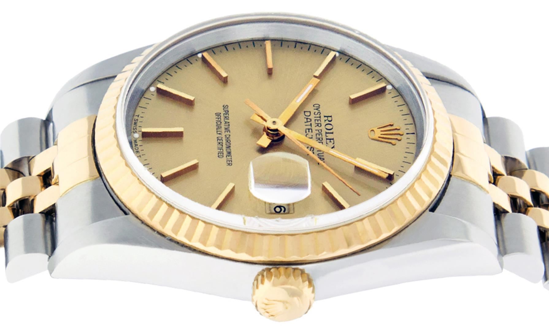 One Mens Rolex Two-Tone 18K Yellow Gold And Stainless Steel Datejust, Polished Bright with Satin Finish, Serviced & Electronically Tested, Rolex Stainless Steel Case: 36mm, Yellow Gold Crown, Rolex Bezel: Rolex 18K Yellow Gold Fluted Bezel. Crystal: Sapphire With Cyclops Lens. Rolex Movement: Automatic Winding Movement Caliber 3135. Rolex Dial: Champagne Index With Line Track And Lumi Dot. Hands: Yellow Luminecent Hands. Date Window: 3 O'Clock Position Date Display, Quickset, Model: Sapphire Quickset Datejust. Condition: G-6 Extra Fine. Rolex Bracelet: 18K Yellow Gold And Stainless Steel Jubilee Band. Bright Polish & Satin Finish. 7.0 Inch Length, Adjustable. Standard Clasp, With Rolex Logo. This Pre Owned Watch Has Been Serviced Time Tested And Is In Excellent Condition It Is Free Of All Scratches And Dents.