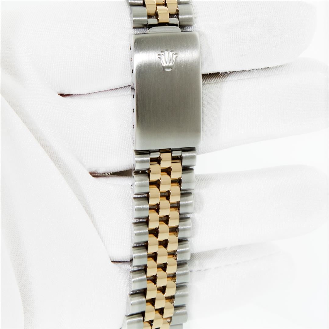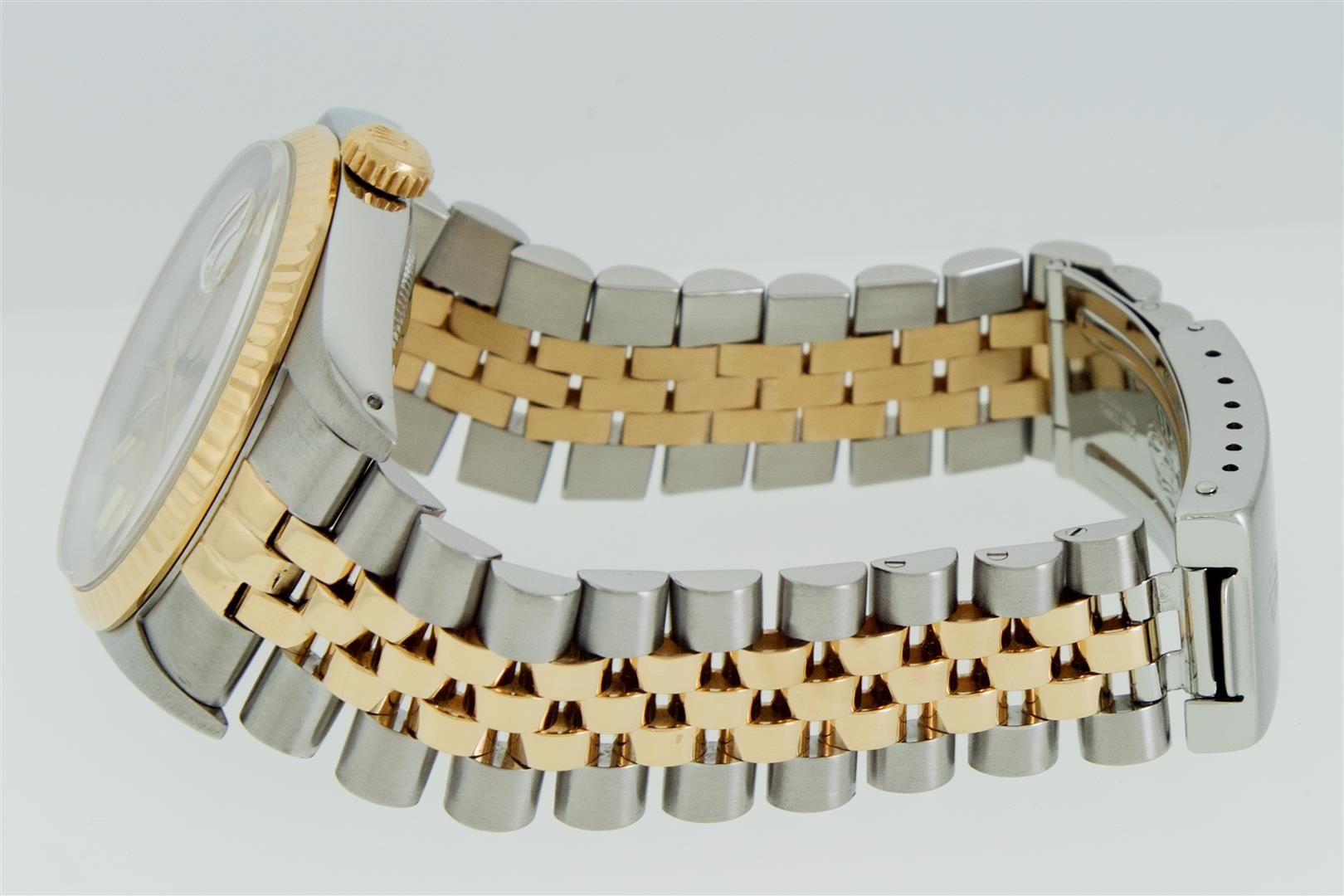 One Mens Pre Owned Yellow Gold Two Tone Rolex Datejust Polished, Serviced & Electronically Tested, Rolex Yellow Gold & Stainless Steel Case: 36mm, Rolex Yellow Gold Crown, Rolex Bezel: Yellow Gold Fluted Bezel. Custom Crystal: New Plastic With Magnified Date Window. Custom Hands: New Luminecent Hands. Rolex Movement: Automatic Winding Movement. Rolex Dial: Champagne Linen Dial With Index Hour Markers and Small Track With Lumi Dots. Date Window: 3 O'Clock Position Date Display, Quickset, Model: Datejust. Condition: G-6 Extra Fine. Rolex Bracelet: Two Tone Yellow Gold & Stainless Steel Jubilee Band. Bright Polish. 7.0 Inch Length, Adjustable. Standard Clasp, With Rolex Logo. This Watch Has Been Serviced Time Tested And Is In Excellent Condition It Is Free Of All Scratches And Dents.