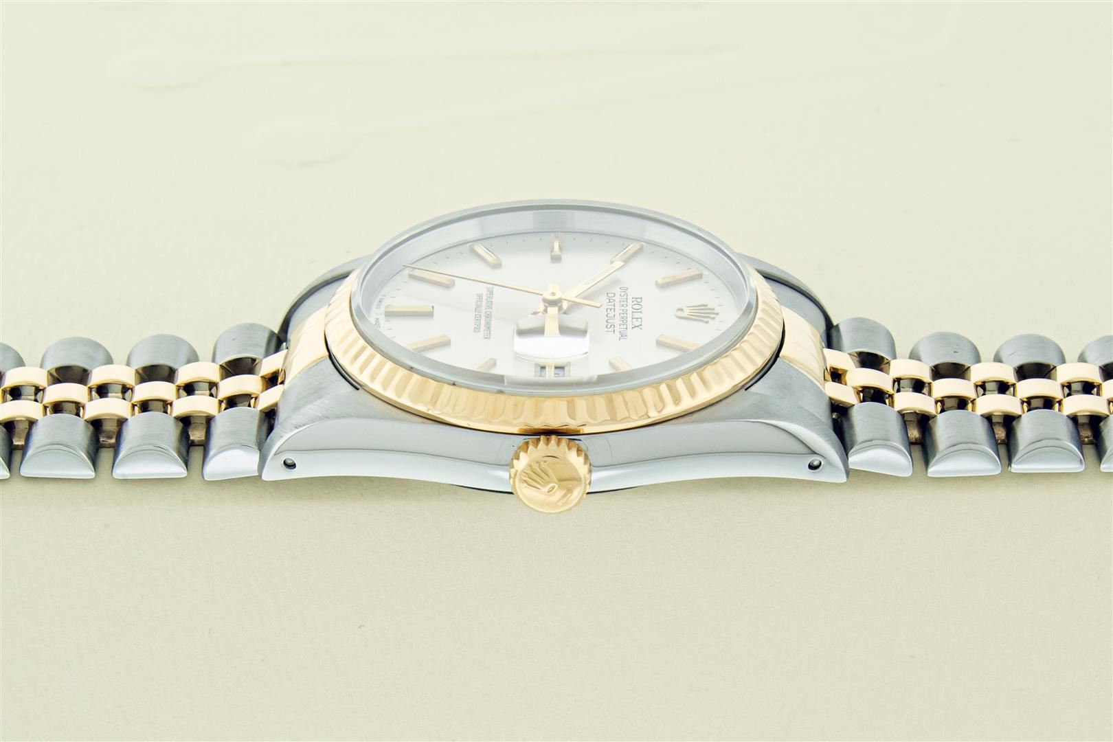 One Mens Pre Owned Yellow Gold Two Tone Rolex Datejust Polished, Serviced & Electronically Tested, Rolex Yellow Gold & Stainless Steel Case: 36mm, Rolex Yellow Gold Crown, Rolex Bezel: Yellow Gold Fluted Bezel. Custom Crystal: New Acrylic Cyclops Lens. Custom Hands: New Luminecent Hands. Rolex Movement: Automatic Winding Movement. Rolex Dial: Silver Dial With Index Hour Markers and Small Track With Lumi Dots. Date Window: 3 O'Clock Position Date Display, Quickset, Model: Datejust. Condition: G-6 Extra Fine. Rolex Bracelet: Two Tone Yellow Gold & Stainless Steel Jubilee Band. Bright Polish. 7.0 Inch Length, Adjustable. Standard Clasp, With Rolex Logo. This Watch Has Been Serviced Time Tested And Is In Excellent Condition It Is Free Of All Scratches And Dents. This Watch Comes With A Rolex Box And Booklets.
