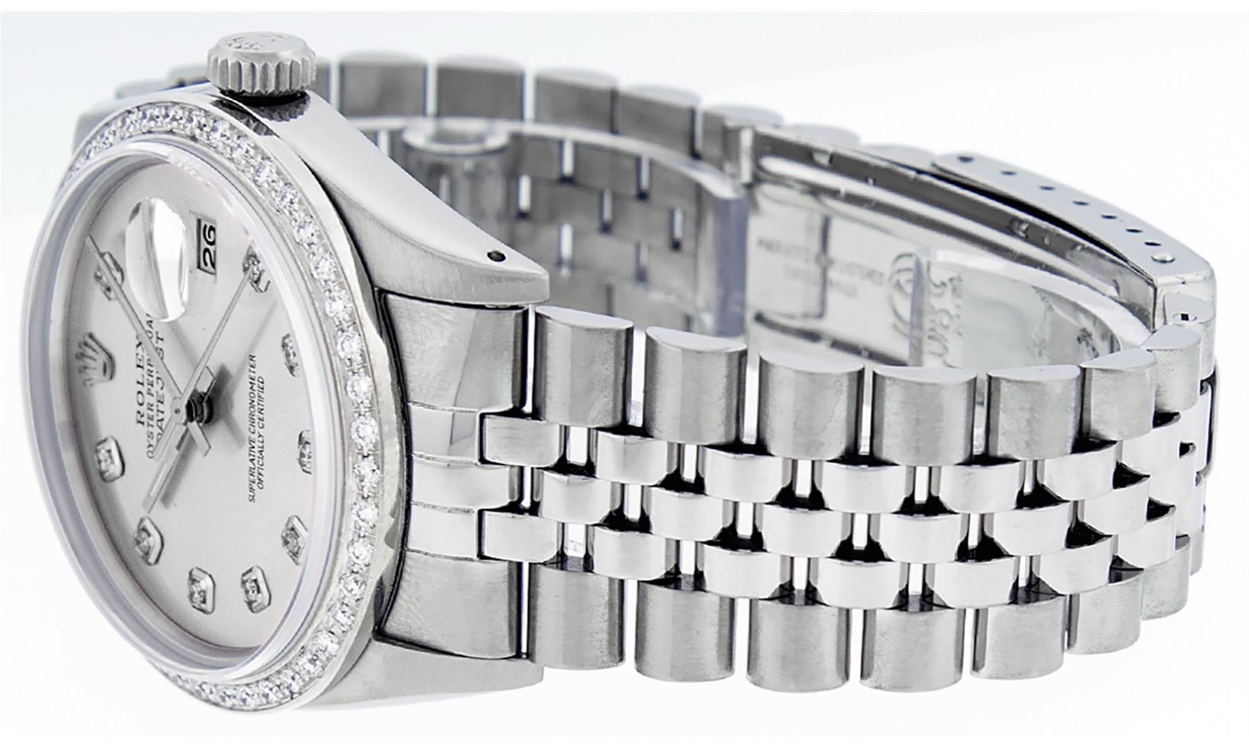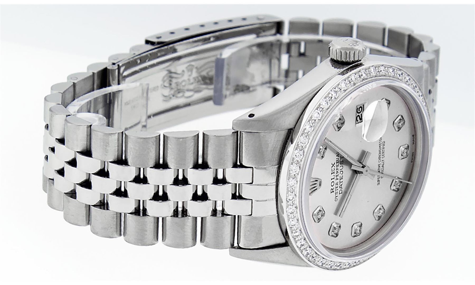One Mens Pre Owned Stainless Steel Rolex Datejust Polished, Serviced & Electronically Tested, Rolex Stainless Steel Case: 36mm, Rolex Stainless Steel Crown, Custom Bezel: New 18K White Gold Bead set Diamond Bezel, Diamond Count: 44 Diamonds In Bezel, Clarity: SI-VS, Color: G to H. Custom Crystal: New Sapphire With Magnified Window. Custom Hands: New Luminescent Hands. Rolex Movement: Automatic Winding Movement. Custom Dial: Refinished To Silver With Custom Added Diamonds, Diamond Count: 10 Diamonds in Dial, G To H In Color, Clarity: SI-VS. Date Window: 3 O'clock Position Date Display, Quickset, Model: Datejust. Condition: G-6 Extra Fine. Rolex Bracelet: Stainless Steel Jubilee Band. Bright Polish & Satin Finish. 7.0 Inch Length, Adjustable. Standard Clasp, With Rolex Logo. This Watch Has Been Serviced Time Tested And Is In Excellent Condition It Is Free Of All Scratches And Dents.