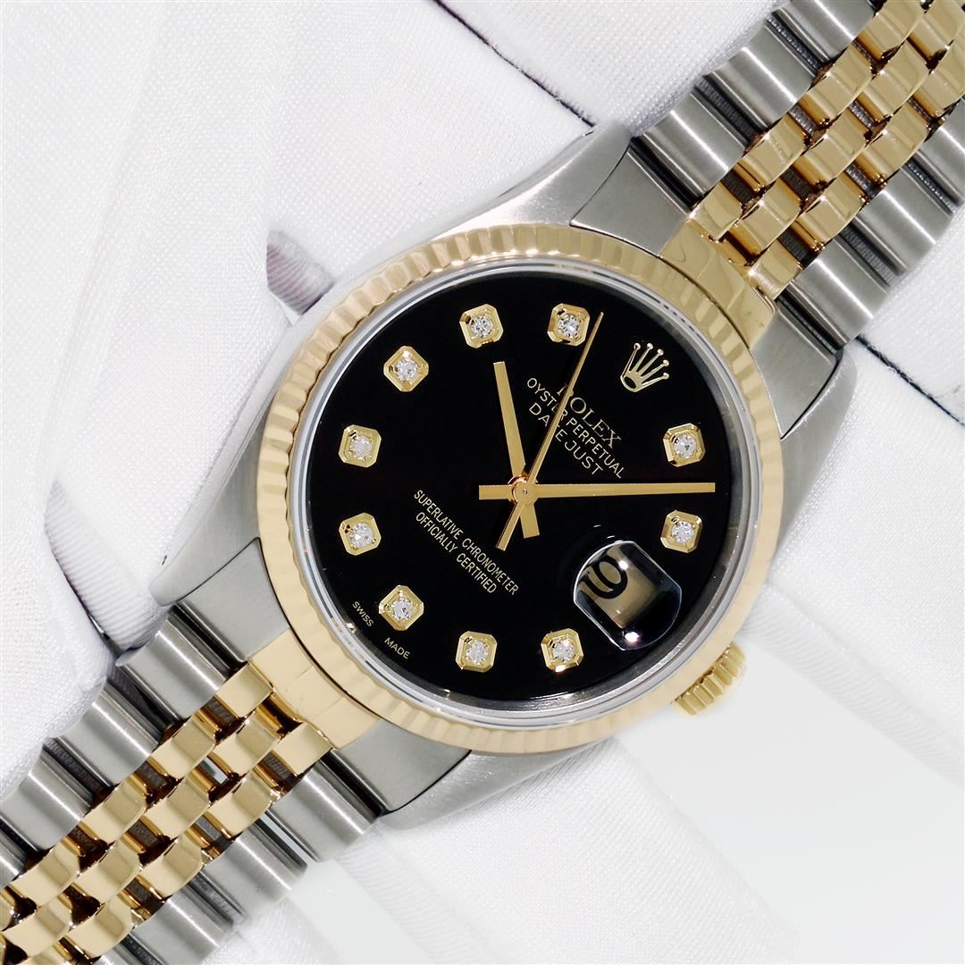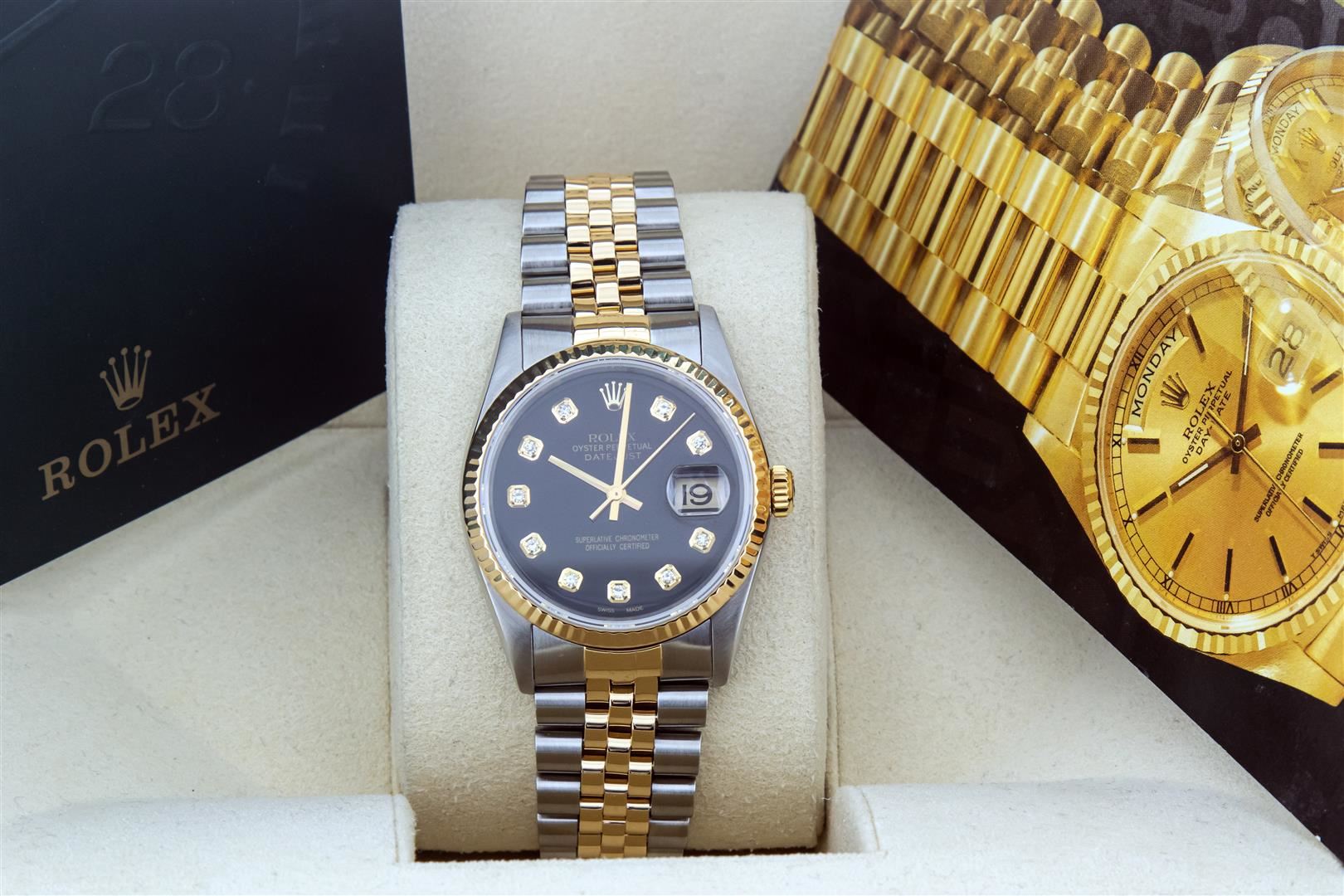 One Mens Pre Owned Yellow Gold Two Tone Rolex Datejust Polished, Serviced & Electronically Tested, Rolex Yellow Gold & Stainless Steel Case: 36mm, Rolex Yellow Gold Crown, Rolex Bezel: Yellow Gold Fluted Bezel. Custom Crystal: New Acrylic Cyclops Lens. Custom Hands: New Gold Hands. Rolex Movement: Automatic Winding Movement. Custom Dial: Refinished To Black Dial Set With VS Added Diamond Hour Markers, Diamond Count: 10 Diamonds in Dial G To H In Color, SI-VS Clarity. Date Window: 3 O'Clock Position Date Display, Quickset, Model: Condition: G-6 Extra Fine. Rolex Bracelet: Two Tone Yellow Gold & Stainless Steel Jubilee Band. Bright Polish. 7.0 Inch Length, Adjustable. Standard Clasp, With Rolex Logo. This Watch Has Been Serviced And Polished It Is Free Of All Scratches And Dents. This Watch Comes With Rolex Box And Booklets.