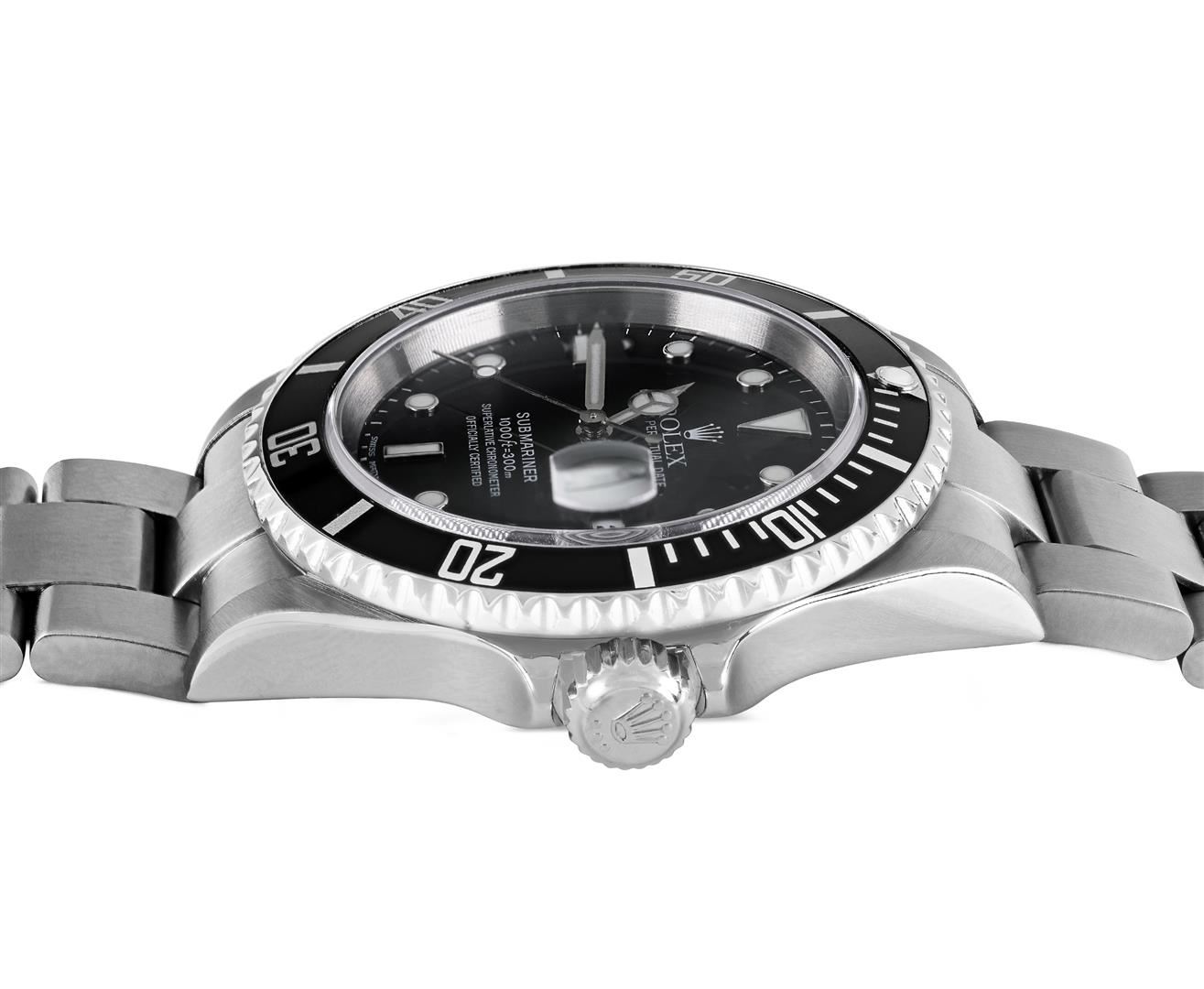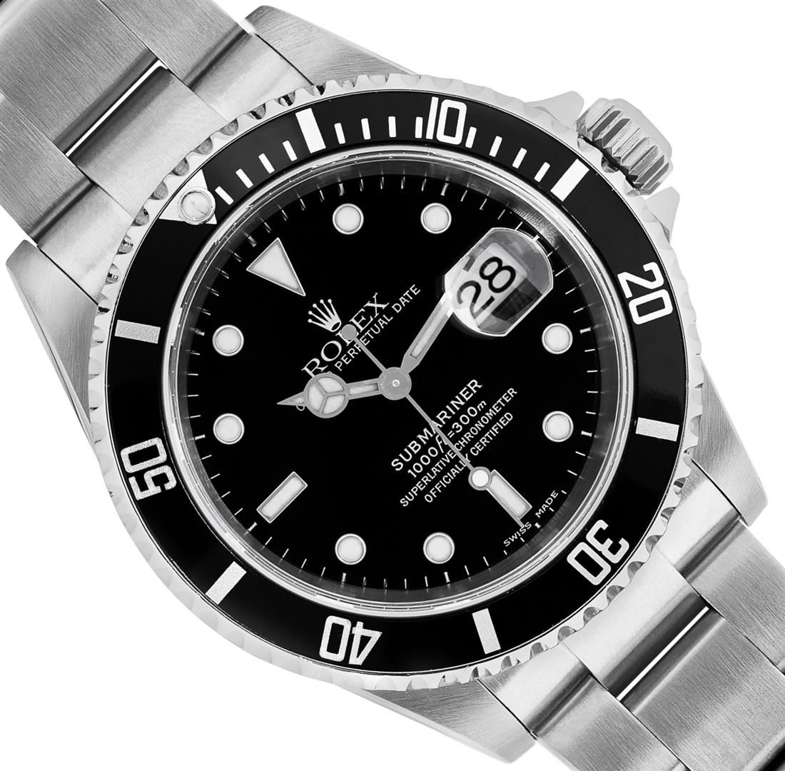 One Mens Pre Owned Rolex Stainless Steel Submariner With Date Polished, Serviced & Electronically Tested, Rolex Stainless Steel Case: 40mm, Rolex Stainless Steel Crown, Rolex Bezel: Stainless Steel Rotatable Bezel With Black Insert. Crystal: Sapphire With Magnified Date Window. Rolex Movement: Automatic Winding Movement Caliber 3135. Rolex Dial: Black Submariner Dial with Luminous Index Hour Markers And Dash Track. Date Window: 3 O'Clock Position Date Display, Model: No Holes Date Submariner, Quickset, Condition: G-6 Extra Fine. Rolex Bracelet: Stainless Steel Oyster Band. Bright Polish & Satin Finish. 7.0 Inch Length, Adjustable. Fold Clasp, With Rolex Logo. This Watch Comes With A Rolex Box.