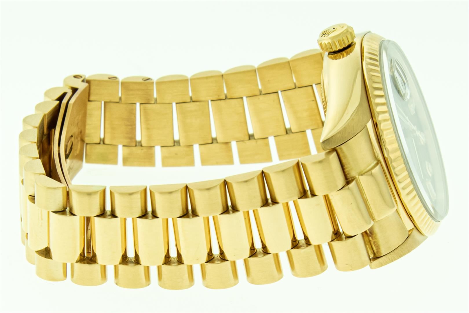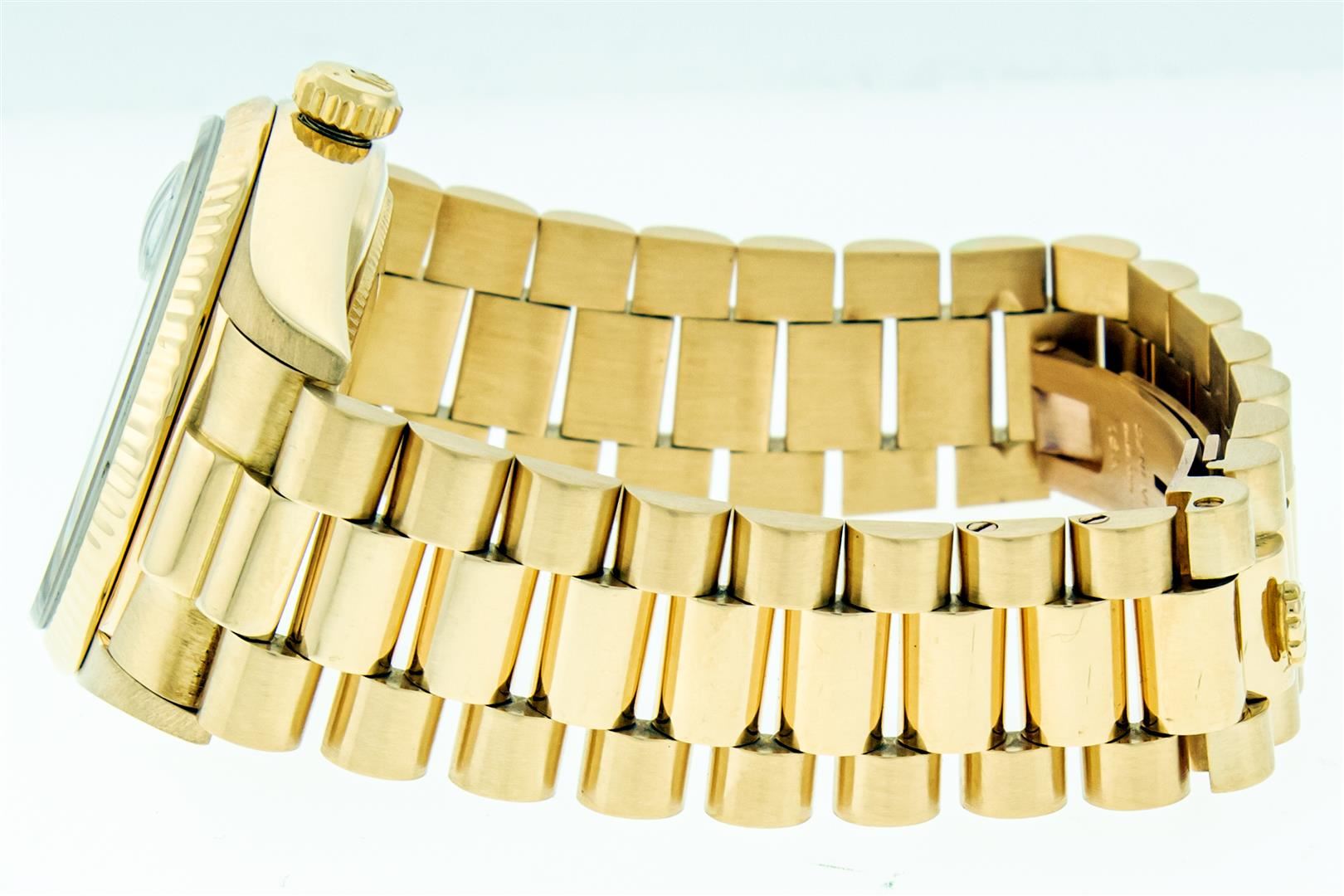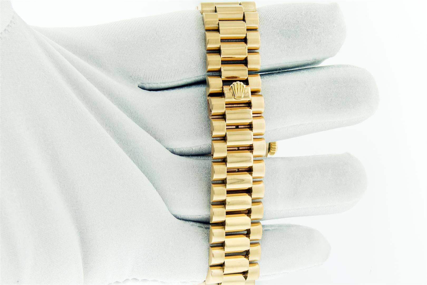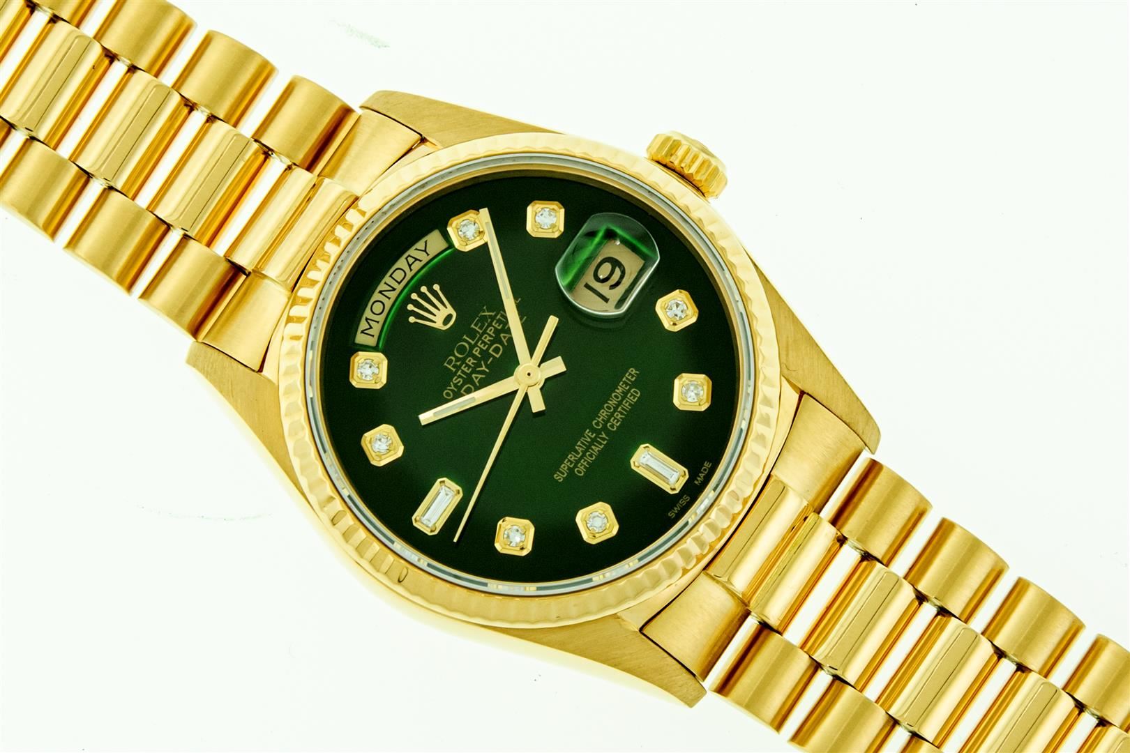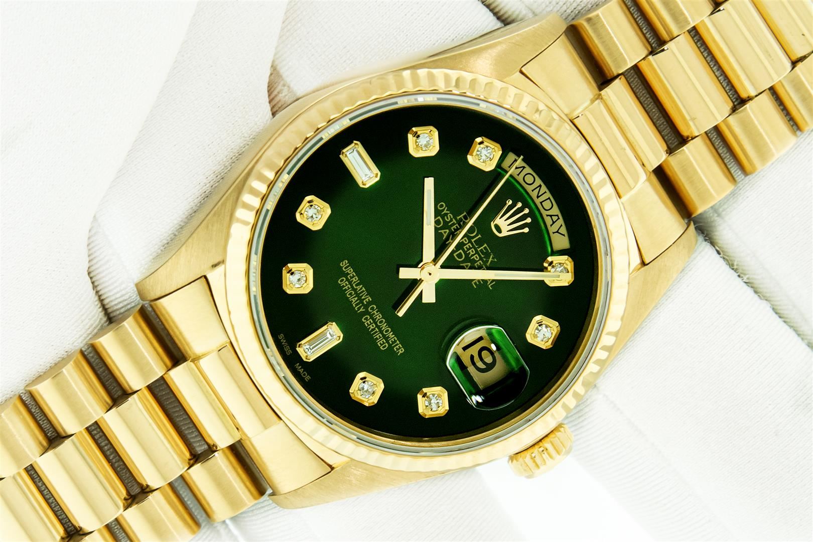 One Mens Pre Owned Quickset Rolex Day Date 18K Yellow Gold Presidential Polished, Serviced & Electronically Tested, Rolex 18K Yellow Gold Case: 36mm, Rolex 18K Yellow Gold Crown, Rolex Bezel: 18K Yellow Gold Fluted Bezel. Custom Crystal: New Scratch Resistant Sapphire Crystal. Custom Hands: New Luminescent Hands. Rolex Movement: Automatic Quickset Winding Movement Caliber 3055. Custom Dial: Refinished To Green Vignette With Custom Added Genuine Single Cut Diamonds, Diamond Count: 8 Diamonds On Dial + 2 Baguettes On 6 + & 9, Color: G To H, Clarity: VS. Date Window: 3 O'Clock Position, Day Display: 12 O'Clock Position, Single Quickset, Model: Day Date President. Condition: G-6 Extra Fine. Rolex Bracelet: 18K Yellow Gold President Band With Hidden Clasp, Bright & Satin Polish. 7.0 Inch Length, Standard President Clasp, With Rolex Logo. This Watch Comes With A Rolex Box, Rolex Booklets, Rolex Wallet, Rolex Hang Tag, & Rolex Polishing Cloth.