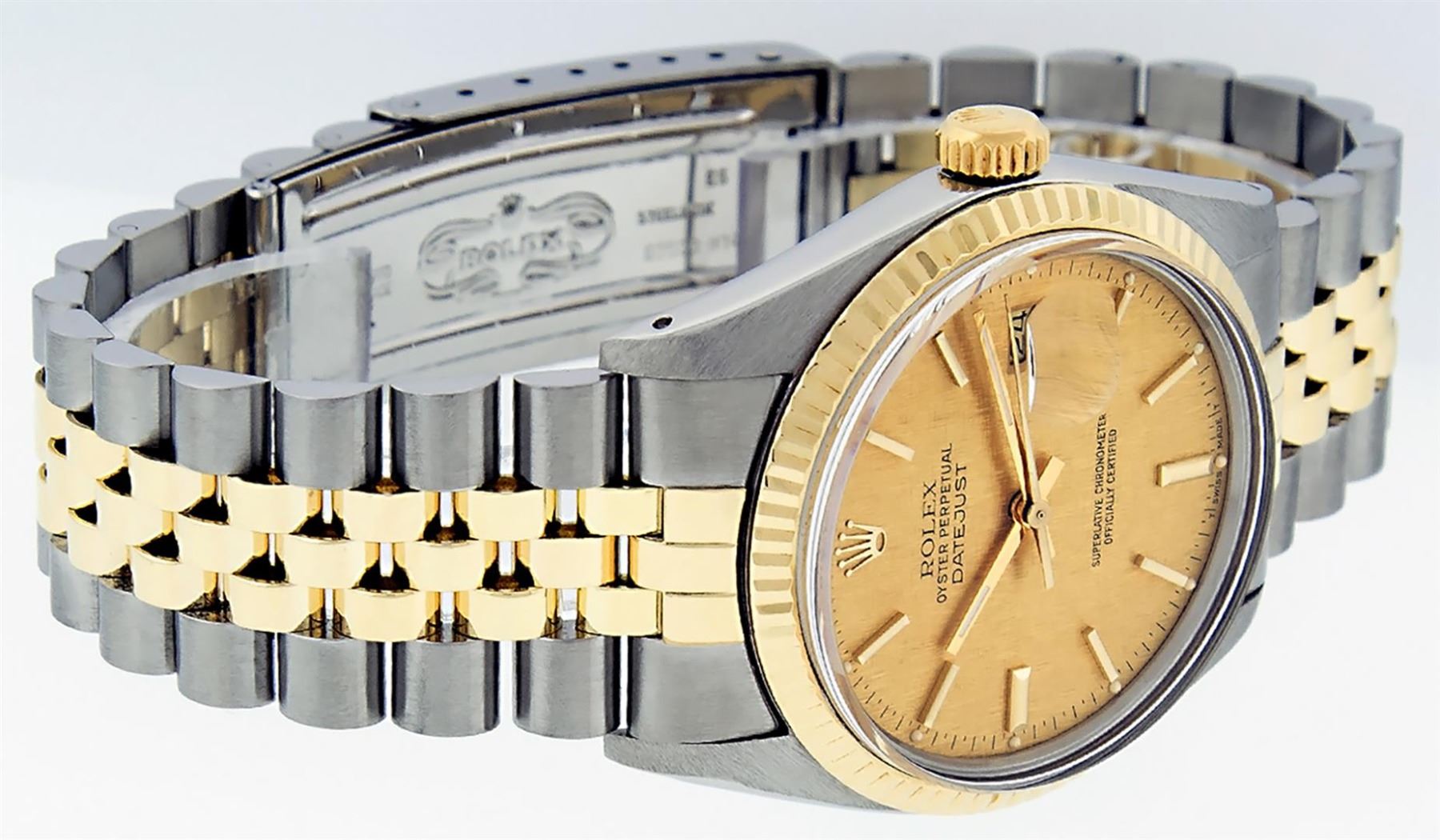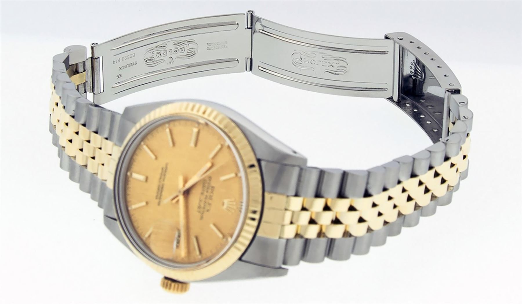 One Mens Pre Owned Quickset Two Tone 14K Yellow Gold And Stainless Steel Datejust Polished, Serviced & Electronically Tested, Yellow Gold & Stainless Steel Case: 36mm, Yellow Gold Crown, Rolex Bezel: 14K Yellow Gold Fluted Bezel. Custom Crystal: New Acrylic With Magnified Date Window. Hands: Luminescent Hands. Rolex Movement: Automatic Winding Movement 3035. Rolex Dial: Champagne Linen Dial With Index Hour Markers and Small Track With Lumi Dots. Date Window: 3 O'Clock Position Date Display, Quickset, Model: Datejust. Condition: G-6 Extra Fine. Rolex Bracelet: Two Tone 14K Yellow Gold & Stainless Steel Jubilee Band. Bright Polish. 7.0 Inch Length, Adjustable. Standard Clasp, With Rolex Logo. This Watch Has Been Serviced Time Tested And Is In Excellent Condition It Is Free Of All Scratches And Dents.
