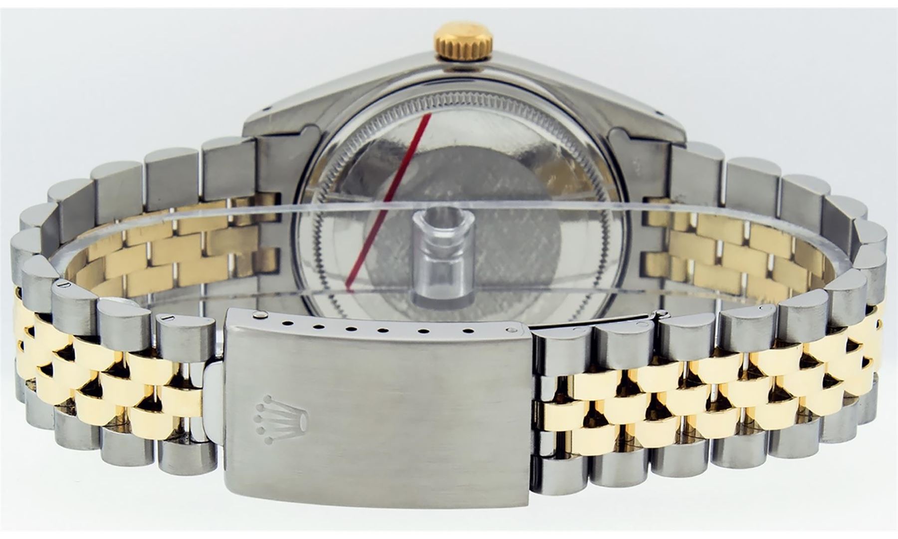 One Mens Pre Owned Quickset Two Tone 14K Yellow Gold And Stainless Steel Datejust Polished, Serviced & Electronically Tested, Yellow Gold & Stainless Steel Case: 36mm, Yellow Gold Crown, Rolex Bezel: 14K Yellow Gold Fluted Bezel. Custom Crystal: New Acrylic With Magnified Date Window. Hands: Luminescent Hands. Rolex Movement: Automatic Winding Movement 3035. Rolex Dial: Champagne Linen Dial With Index Hour Markers and Small Track With Lumi Dots. Date Window: 3 O'Clock Position Date Display, Quickset, Model: Datejust. Condition: G-6 Extra Fine. Rolex Bracelet: Two Tone 14K Yellow Gold & Stainless Steel Jubilee Band. Bright Polish. 7.0 Inch Length, Adjustable. Standard Clasp, With Rolex Logo. This Watch Has Been Serviced Time Tested And Is In Excellent Condition It Is Free Of All Scratches And Dents.