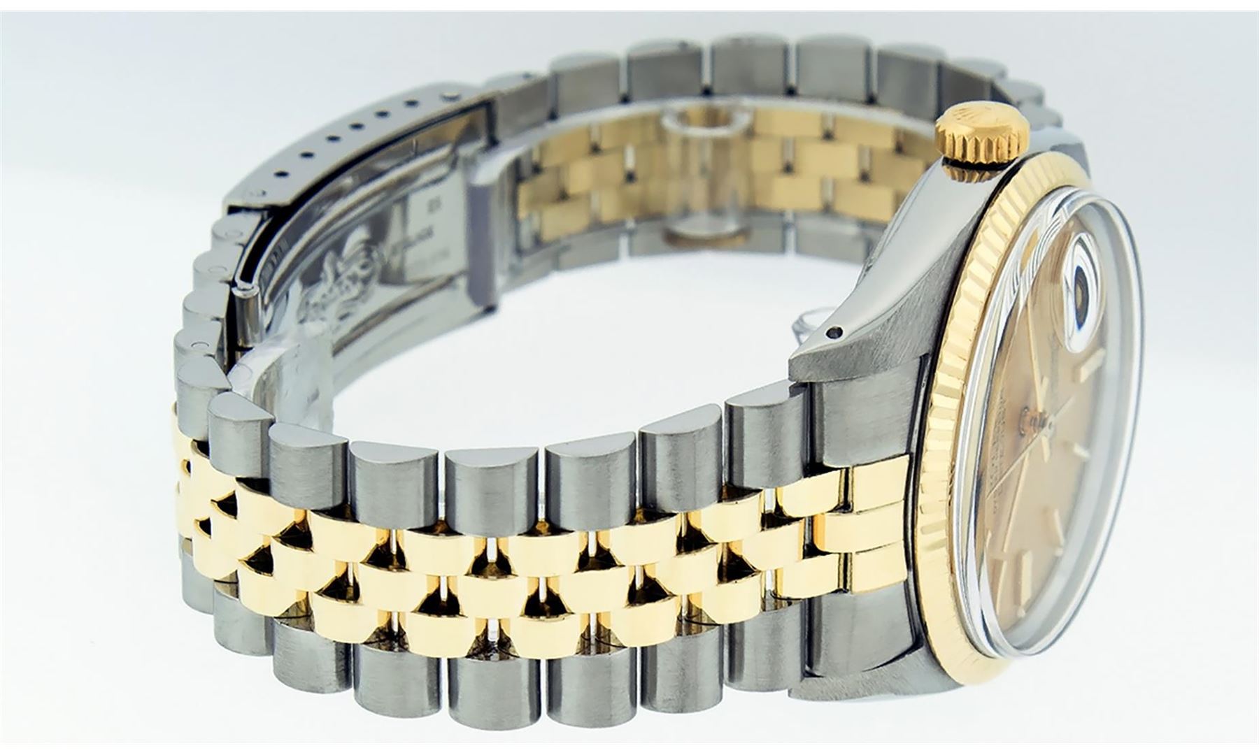 One Mens Pre Owned Quickset Two Tone 14K Yellow Gold And Stainless Steel Datejust Polished, Serviced & Electronically Tested, Yellow Gold & Stainless Steel Case: 36mm, Yellow Gold Crown, Rolex Bezel: 14K Yellow Gold Fluted Bezel. Custom Crystal: New Acrylic With Magnified Date Window. Hands: Luminescent Hands. Rolex Movement: Automatic Winding Movement 3035. Rolex Dial: Champagne Linen Dial With Index Hour Markers and Small Track With Lumi Dots. Date Window: 3 O'Clock Position Date Display, Quickset, Model: Datejust. Condition: G-6 Extra Fine. Rolex Bracelet: Two Tone 14K Yellow Gold & Stainless Steel Jubilee Band. Bright Polish. 7.0 Inch Length, Adjustable. Standard Clasp, With Rolex Logo. This Watch Has Been Serviced Time Tested And Is In Excellent Condition It Is Free Of All Scratches And Dents.