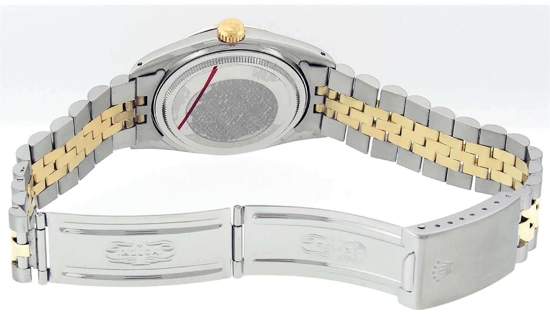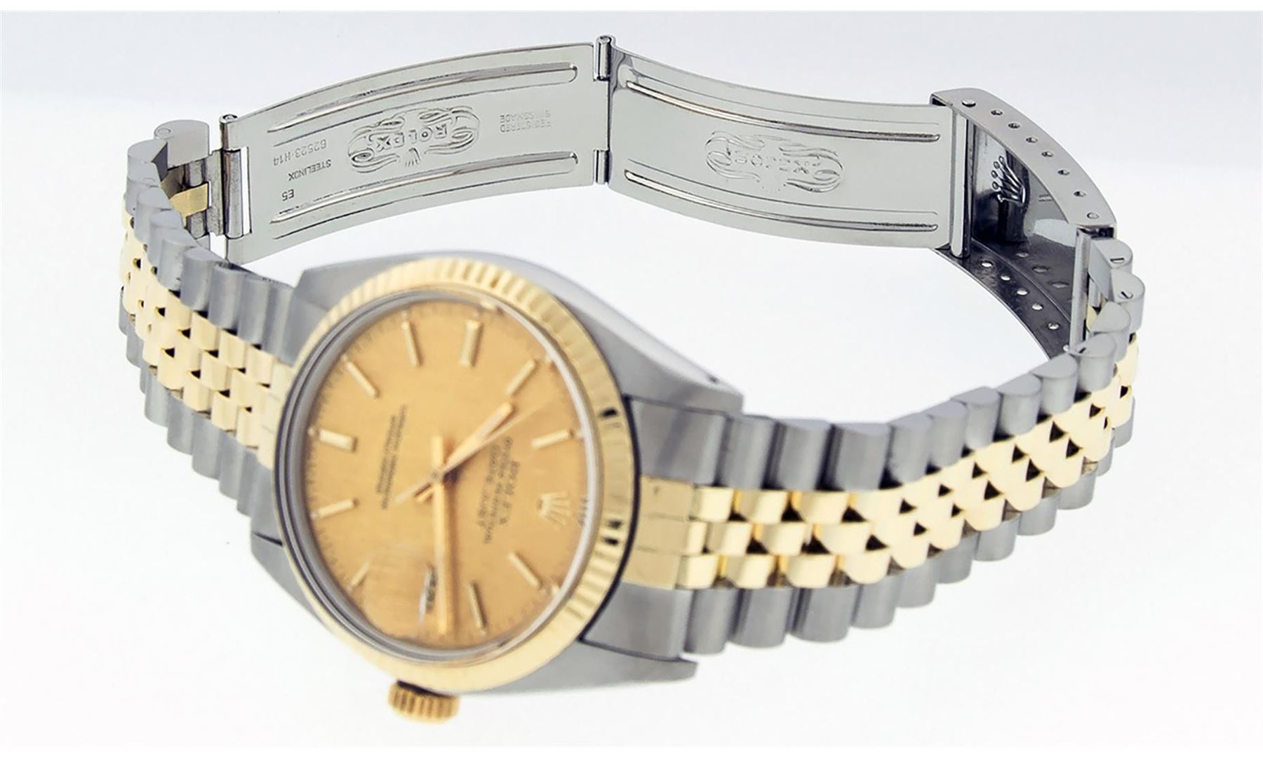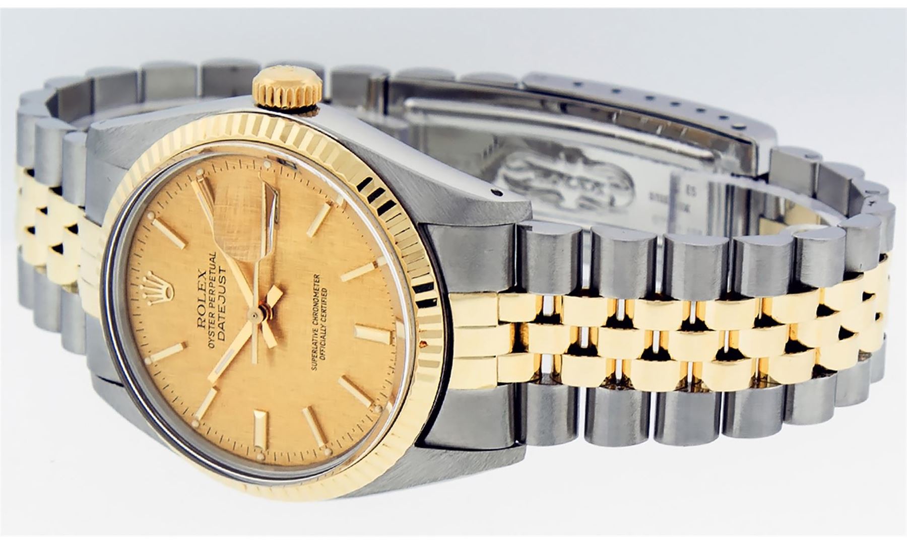 One Mens Pre Owned Quickset Two Tone 14K Yellow Gold And Stainless Steel Datejust Polished, Serviced & Electronically Tested, Yellow Gold & Stainless Steel Case: 36mm, Yellow Gold Crown, Rolex Bezel: 14K Yellow Gold Fluted Bezel. Custom Crystal: New Acrylic With Magnified Date Window. Hands: Luminescent Hands. Rolex Movement: Automatic Winding Movement 3035. Rolex Dial: Champagne Linen Dial With Index Hour Markers and Small Track With Lumi Dots. Date Window: 3 O'Clock Position Date Display, Quickset, Model: Datejust. Condition: G-6 Extra Fine. Rolex Bracelet: Two Tone 14K Yellow Gold & Stainless Steel Jubilee Band. Bright Polish. 7.0 Inch Length, Adjustable. Standard Clasp, With Rolex Logo. This Watch Has Been Serviced Time Tested And Is In Excellent Condition It Is Free Of All Scratches And Dents.